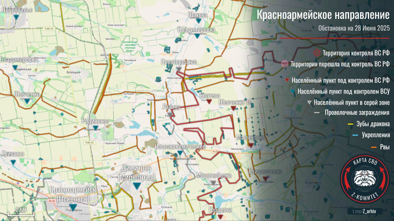 ВС РФ ведут активную работу по созданию северной клешни для охвата Красноармейской агломерации. Дальнейшее продвижжение к северу от Красноармейска и Мирнограда позволит взять под прямой или огневой контроль дороги в агломерацию с севера и северо-запада, что неизбежно скажется на логистике Красноармейской группировки ВСУ.