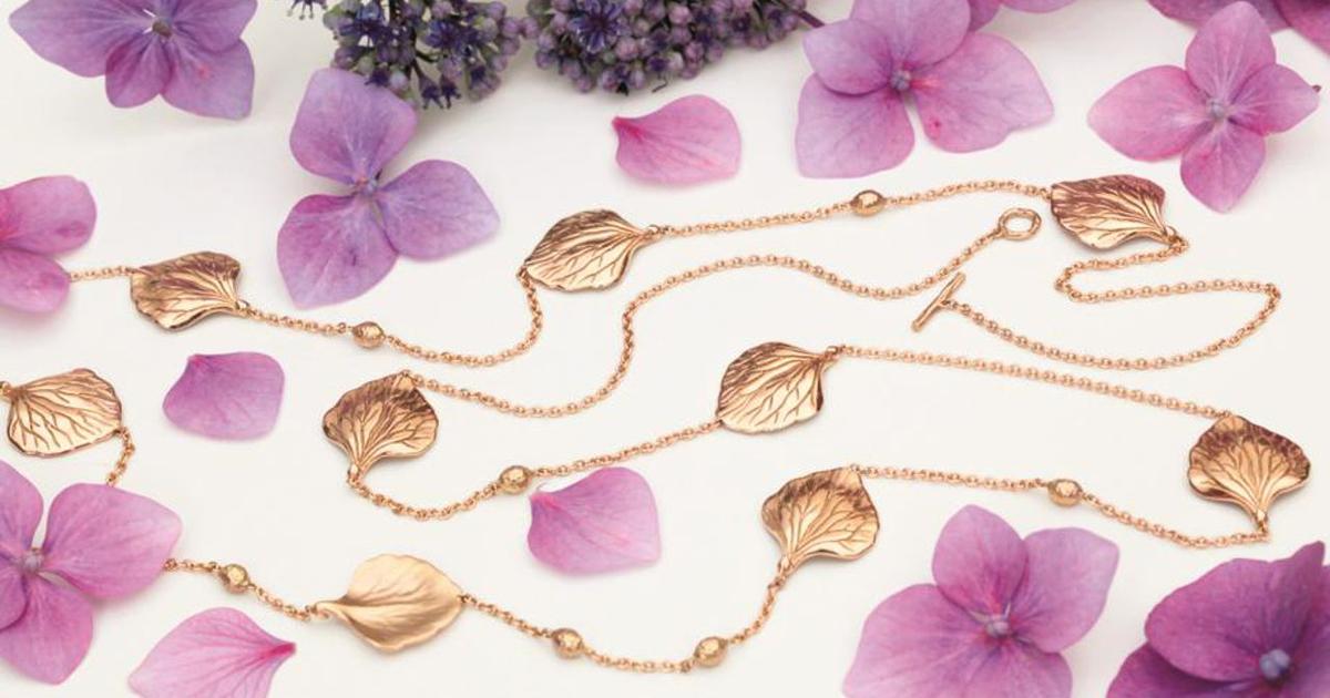 Même souci du détail et du jeu chez la peintre Maïlys Seydoux-Dumas, dont les bijoux d’artiste s’inspirent d’éléments organiques pour mieux les détourner: d’une longue pelure de pomme passée autour du cou est née l’idée d’une première collection baptisée Pomona, la déesse du verger. Sa dernière série d’«objets de rêve» (un collier articulé, une broche, un pendentif), lui a été soufflée par une promenade automnale sur le boulevard Arago à Paris: «Toutes ces feuilles de marronniers sur le sol m’ont évoqué les colliers que l’on essayait, enfants, de faire tenir avec des tiges. Je voulais donner l’impression que les feuilles viennent de tomber de l’arbre et d’être ramassées.» Percées par des rameaux dorés, les longues feuilles en argent patiné du collier semblent avoir été assemblées par le vent.