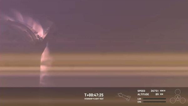 В этот момент Starship окружили потоки плазмы, но установленная на внешней поверхности камера продолжала трансляцию, несмотря на создаваемые плазмой помехи — эти кадры можно назвать уникальными. На высоте около 65 километров передача видеосигнала и данных телеметрии прервалась — вскоре в компании признали, что в этот момент Starship разрушился.