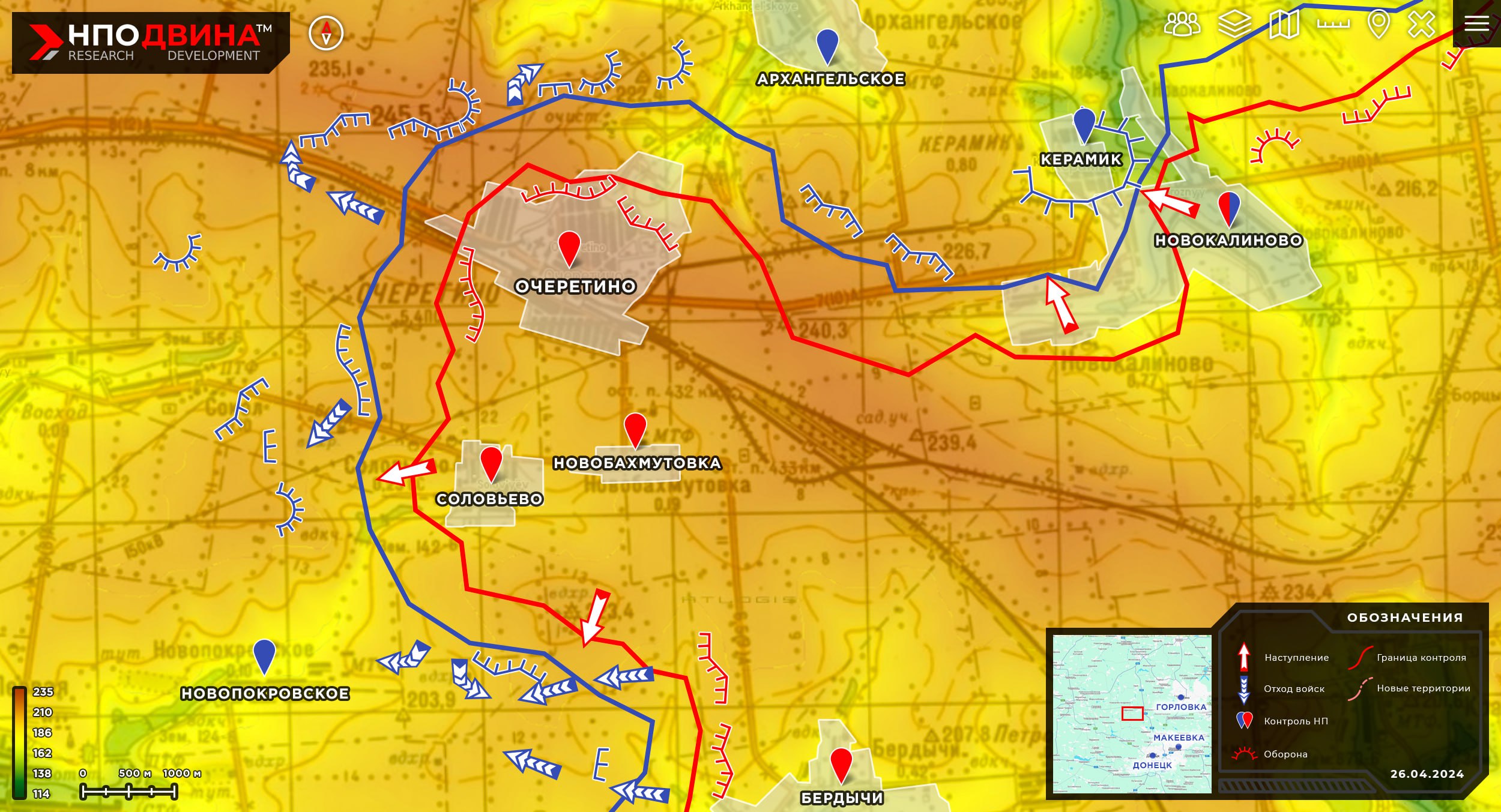 3. Под угрозой Новокалиново (которую штурмуют российские войска), Керамик и Архангельское. К югу от Очеретино противник будет постепенно откатываться на линии водоемов и Карловского водохранилища. Стабилизировать фронт противник пока не может.