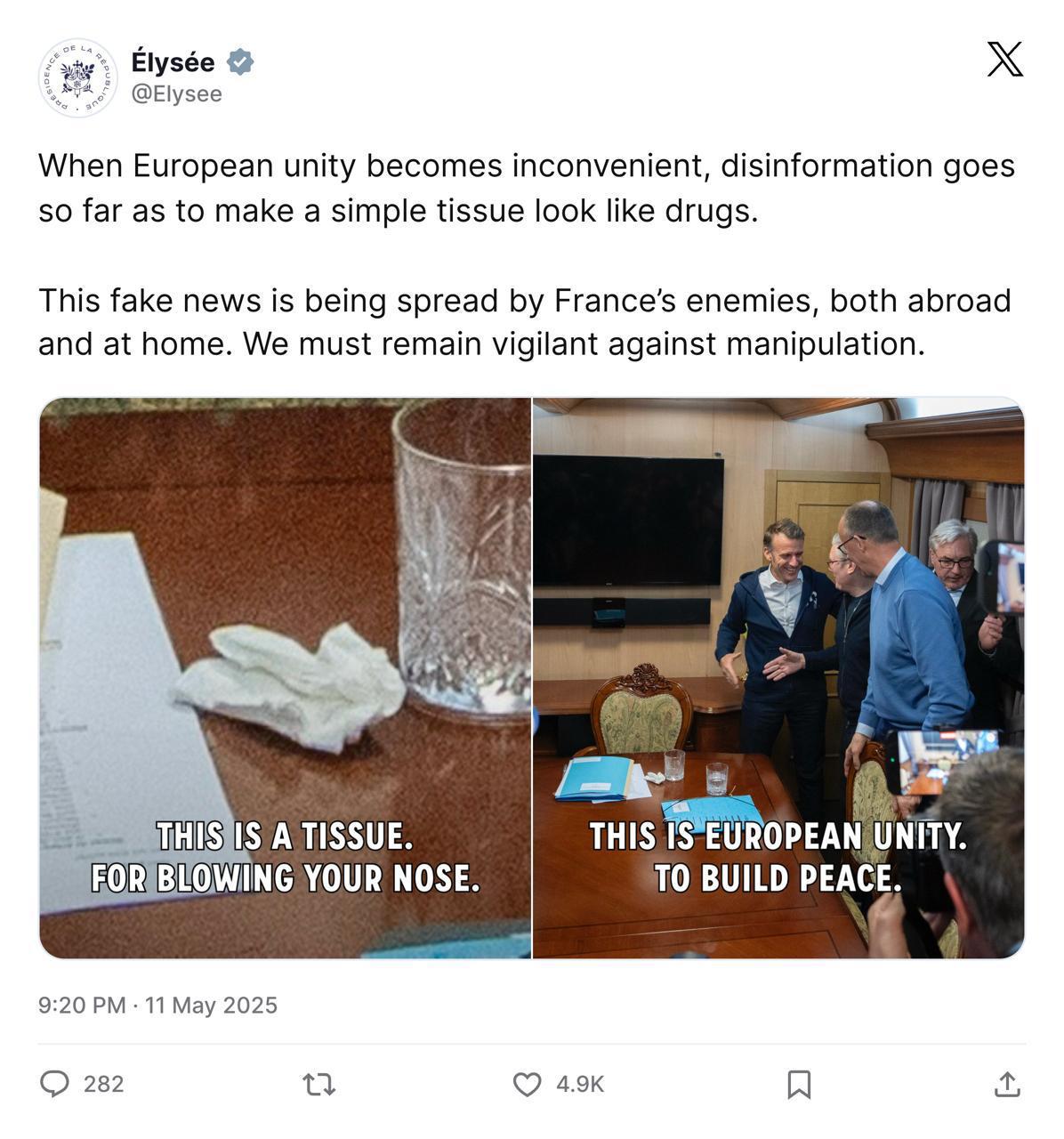 Елисейскому дворцу пришлось оправдываться и заявлять, что президент Франции убрал со стола простую бумажную салфетку, а «информацию про кокаин распространяют враги Франции».