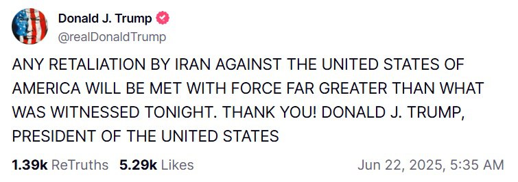 Любой ответ Ирана против США будет встречен гораздо большей силой, чем было применено сегодня, угрожает Трамп.