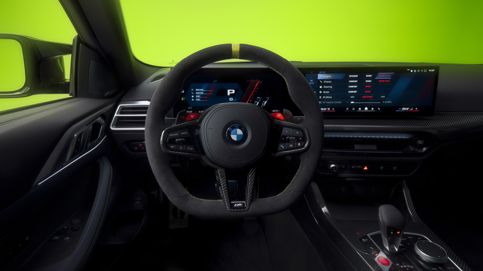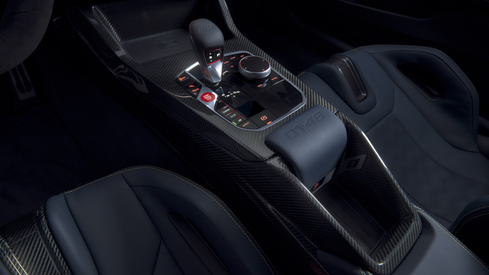 Кроме того, оба исполнения BMW M4 CS VR46 получили контрастные жёлто-зелёные акценты: этим цветом выделена внутренняя окантовка огромных фирменных «ноздрей» радиаторной решётки, тормозные суппорты, часть сложного узора колёсных дисков, декор на крышке багажника, а также крупная надпись «VR46» с автографом Валентино Росси, размещённая на крыше. Помимо этого, у версии Sport яркая тонкая полоска проходит вдоль по дуге вдоль верхней части линии остекления.