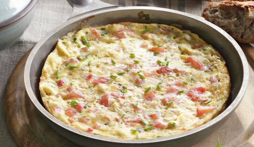 5. Взбейте яйца,добавьте содержимое сковороды. Разогрейте на сильном огне смесь 1 ст. л. оливкового масла со сливочным. Вылейте на сковороду яично-помидорную смесь. На сильном огне готовьте 5 мин.