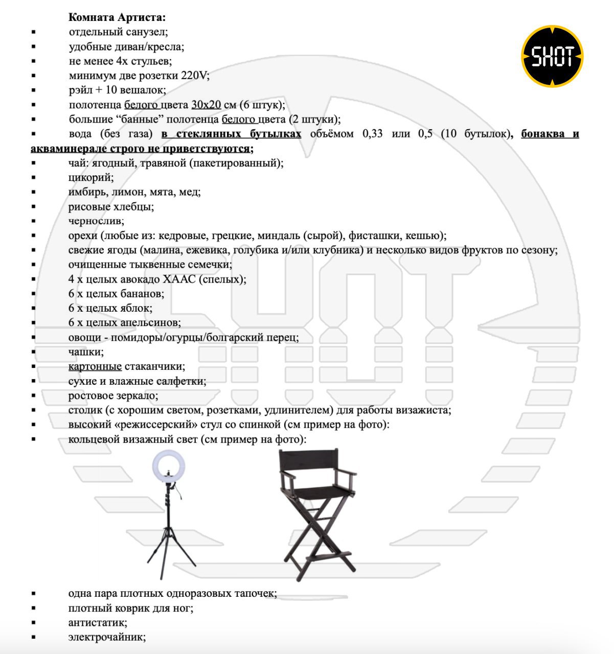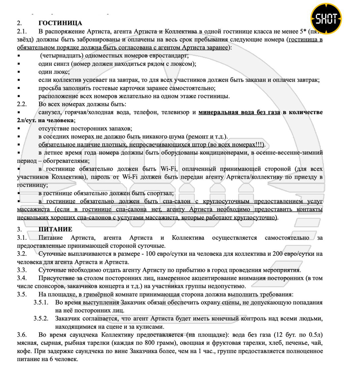Вера и её команда предпочитают ездить на микроавтобусах класса люкс строго без парфюмов и прочих амбре. В гостинице — номер сингл для помощника, люкс для Веры, остальные — евростандарт. Строго шторы блэкаут, спа-салон и спортзал обязательно. В гримёрке у Брежневой сплошное ПП: цикорий, орехи, сухофрукты, хлебцы, фрукты и ягоды.