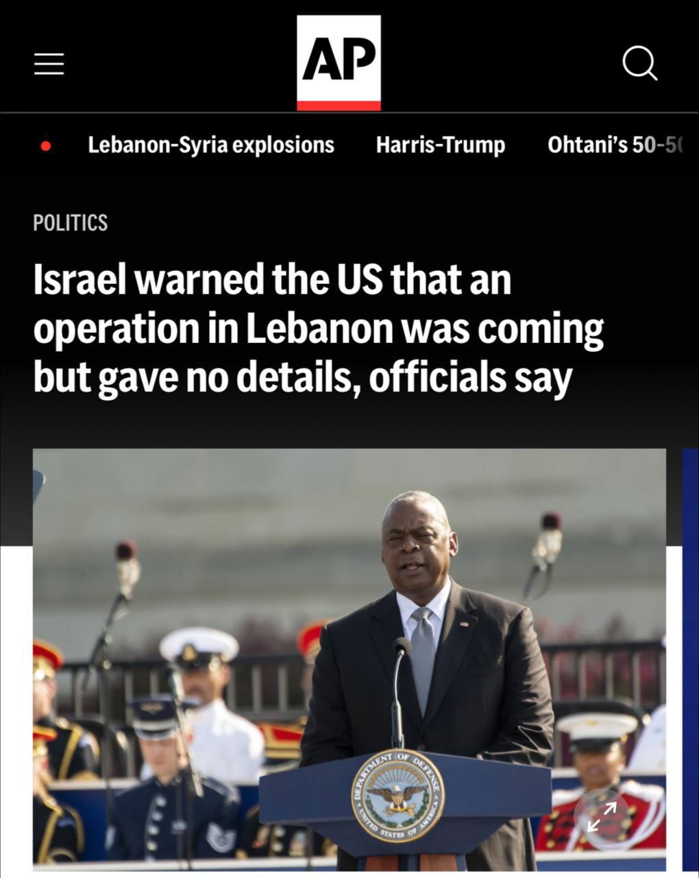 🤔Глава Минобороны Израиля Галант перед взрывами пейджеров в Ливане в телефонном разговоре с главой Пентагона Остином предупреждал его о скором начале «военной операции» — Associated Press.
