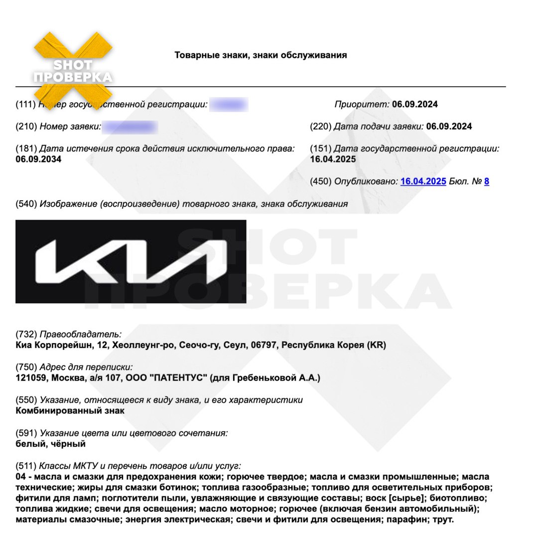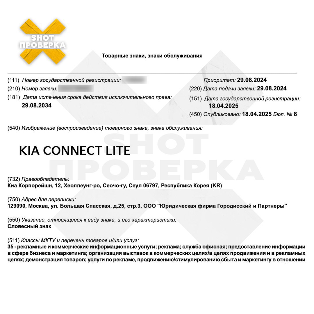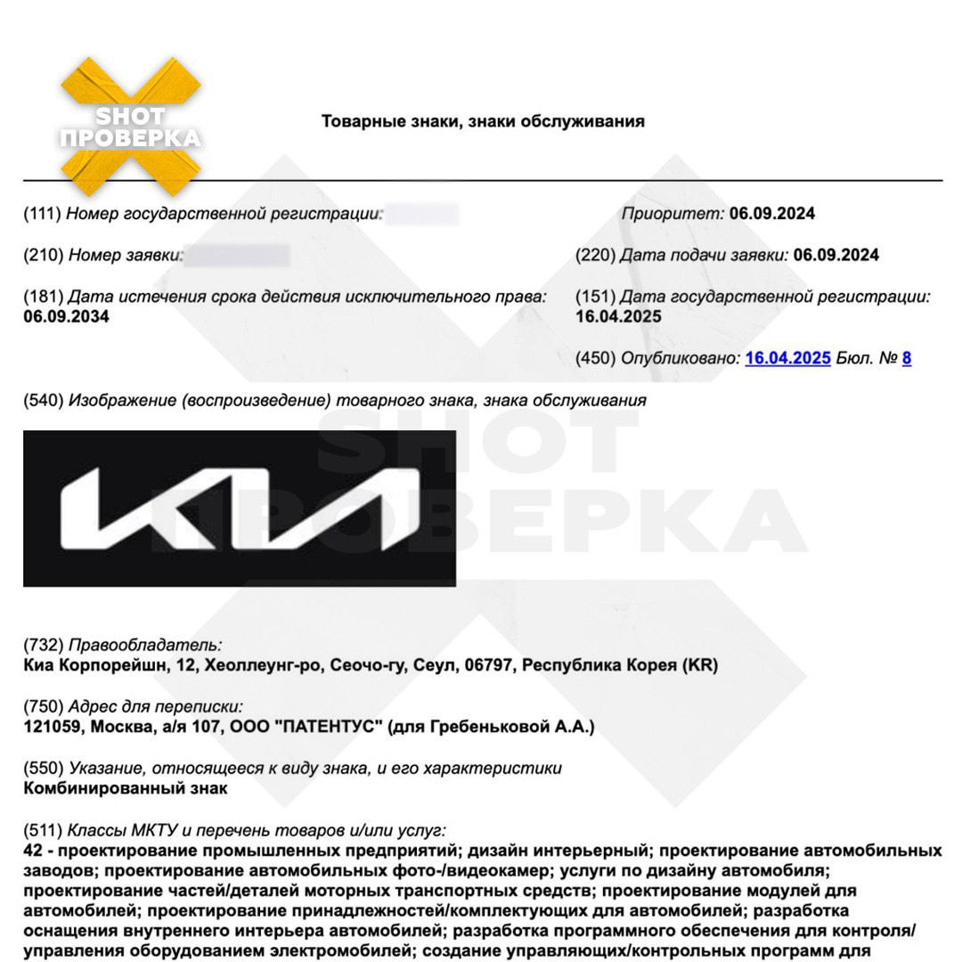 По данным SHOT ПРОВЕРКИ, в апреле южнокорейскому производителю одобрили четыре заявки на регистрацию товарного знака. Один из них позволит компании проектировать автомобильные заводы и промышленные предприятия. Два других — производить масла, машины, а также обслуживать их. Четвёртый зарегистрированный товарный знак — Kia Connect. Это технологический сервис производителя, который позволяет дистанционно активировать различные функции автомобиля. Заявки были на рассмотрении в Роспатенте с августа-сентября 2024 года.