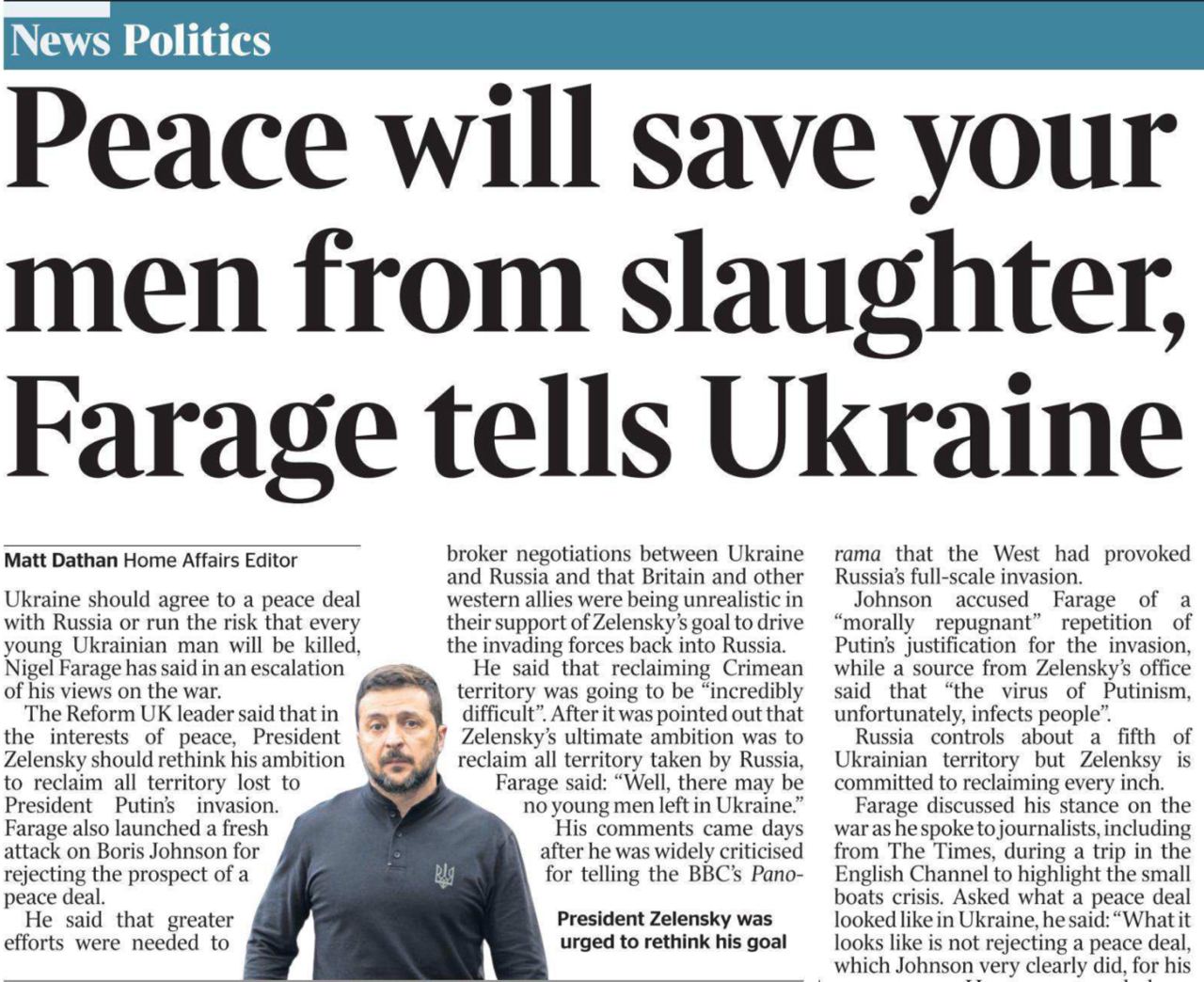 Лидер партии Reform UK Найджел Фарадж, несмотря на бешеное давление мейнстрима, продолжает свою линию относительно Украины. Он снова призвал Зеленского к заключению мирного соглашения с Россией путем уступки части территории, которую Киев все еще считает украинской. В противном случае, сказал Фарадж, «каждый молодой украинский мужчина будет убит».