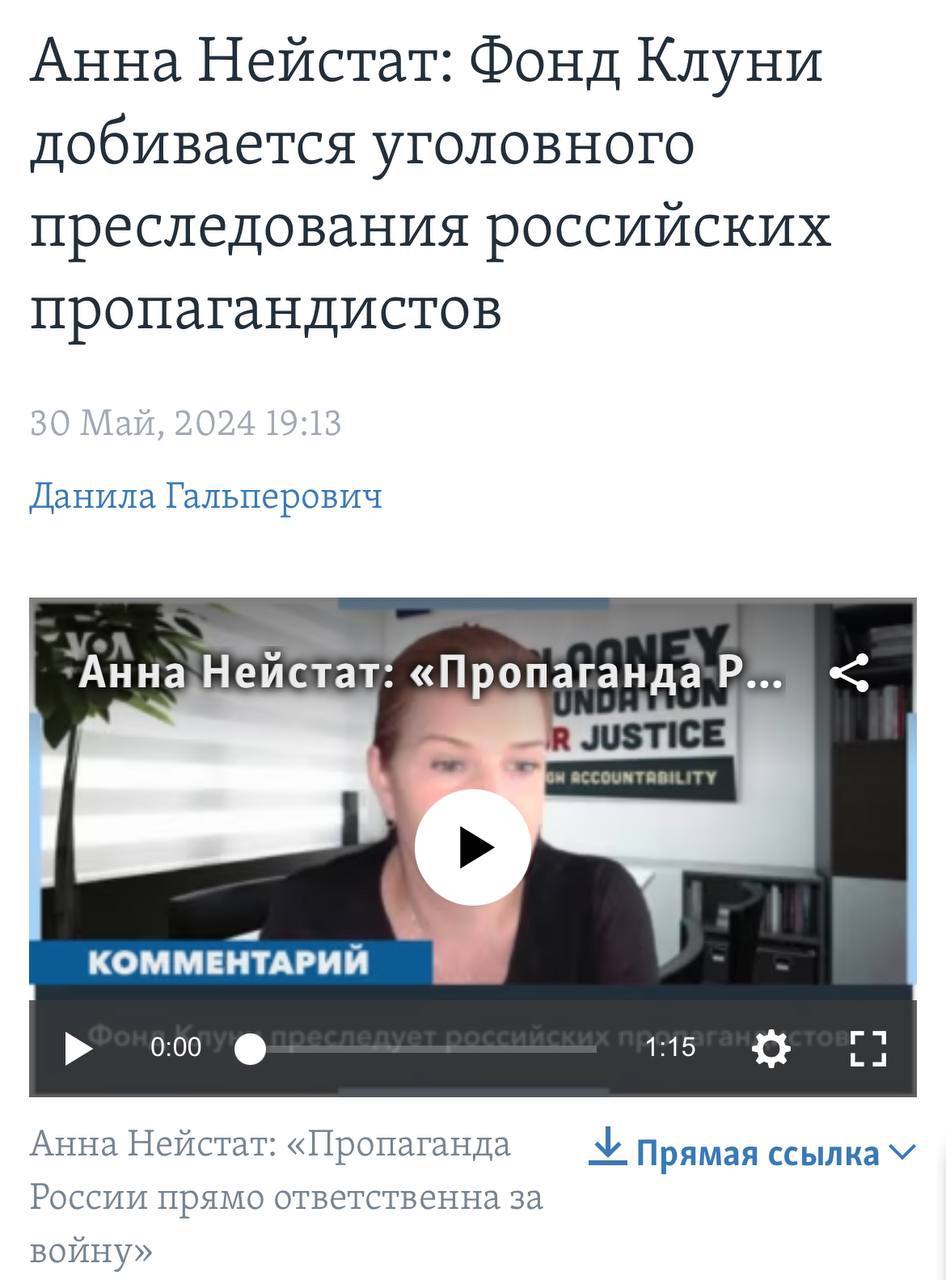 'Сейчас мы сосредоточены на привлечении к ответственности наиболее очевидных российских пропагандистов. Мы просим об ордерах закрытого типа, чтобы имена не раскрывались. И это важно, потому что мы не хотим, чтобы эти люди знали о таком ордере, — напротив, мы хотим, чтобы они выезжали в другие страны и были там арестованы', — директор по юридическим вопросам фонда Клуни.