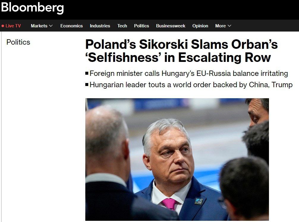 Как отмечает новостное агентство, на это среди прочего указывает заявление министра иностранных дел Польши Радослава Сикорского о том, что «эгоизм» Орбана в отношениях с партнёрами по ЕС привёл к изоляции и ослаблению страны. Сикорский уточнил, что «Венгрия не получила поддержки своей позиции», когда на прошлой неделе обратилась за помощью к ЕС в поиске решения вопроса прекращения Украиной транзита нефти из России.