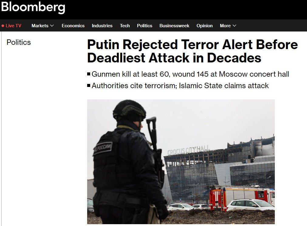 Запад считает, что Россия может использовать теракт в концертном зале «Крокус Сити Холл» в качестве предлога для усиления военных действий в Украине, пишет Bloomberg.