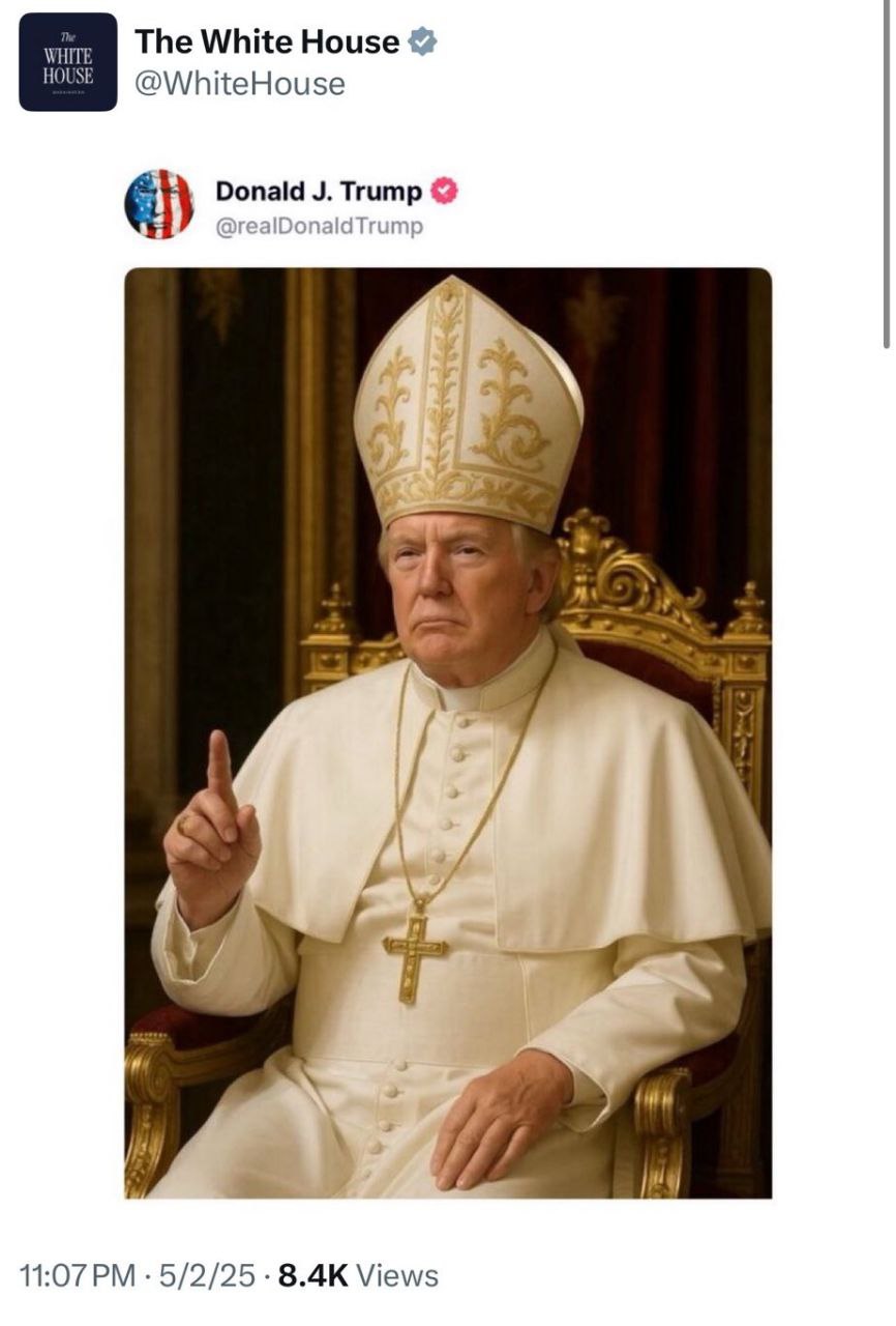 Мы обсуждали с вами подъем католической церкви в Америке и то, что там не прочь были бы продвинуть своего кандидата на пост нового Папы, но Трамп и это превратил в фарс. Заявил, что сам хотел бы занять пост, выложил в соцсетях сгенерированное фото в папской одежде, вслед за этим широко распространилось видео. Когда авторитетному кардиналу из Нью-Йорка Тимоти Долану (то есть тому американскому кандидату, который реально мог участвовать в выборах Папы) задали вопрос, как он к этому относится, он грустно пожал плечами и сказал по итальянски "Brutta figura", что переводится как нелепица, позор. Напоминаю, за Трампа проголосовало большинство американских католиков, а трамписты в целом продвигают объединение христиан вне церквей.