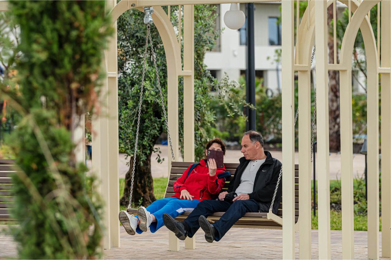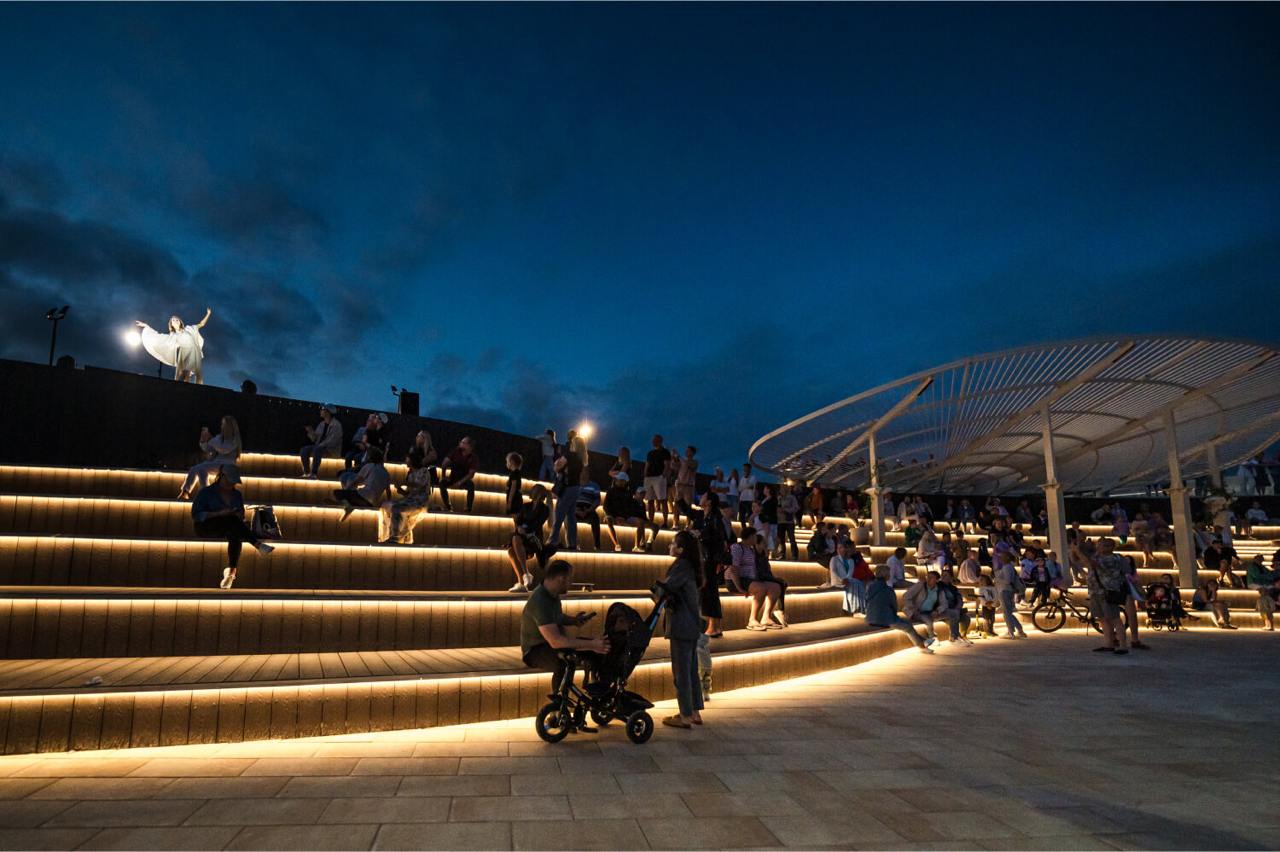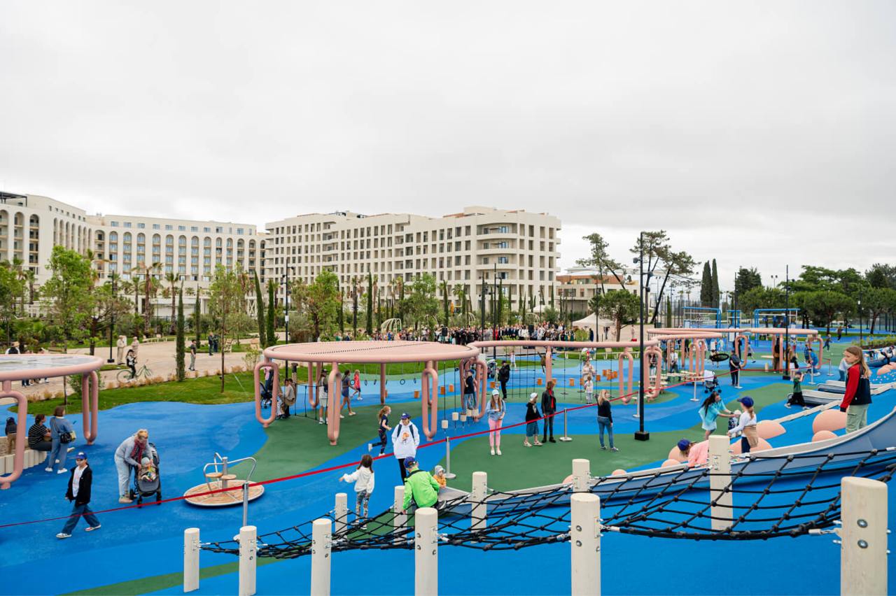 На территории видовые площадки, японский сад, пляжные качели, площадка для большого тенниса, многоуровневая детская площадка и зоны для занятий йогой и воркаутом. Центральное место занимает площадь с концертной зоной и амфитеатром с видом на море.