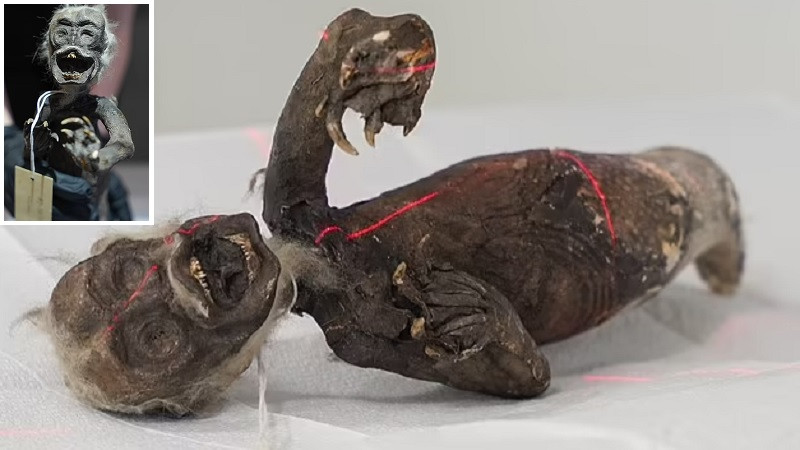 Мумифицированное существо выглядит как гибрид обезьяны, рыбы и рептилии. «Кричащая русалка» может похвастаться необычными зубами, длинными когтями, рыбьим хвостом и седыми волосами.