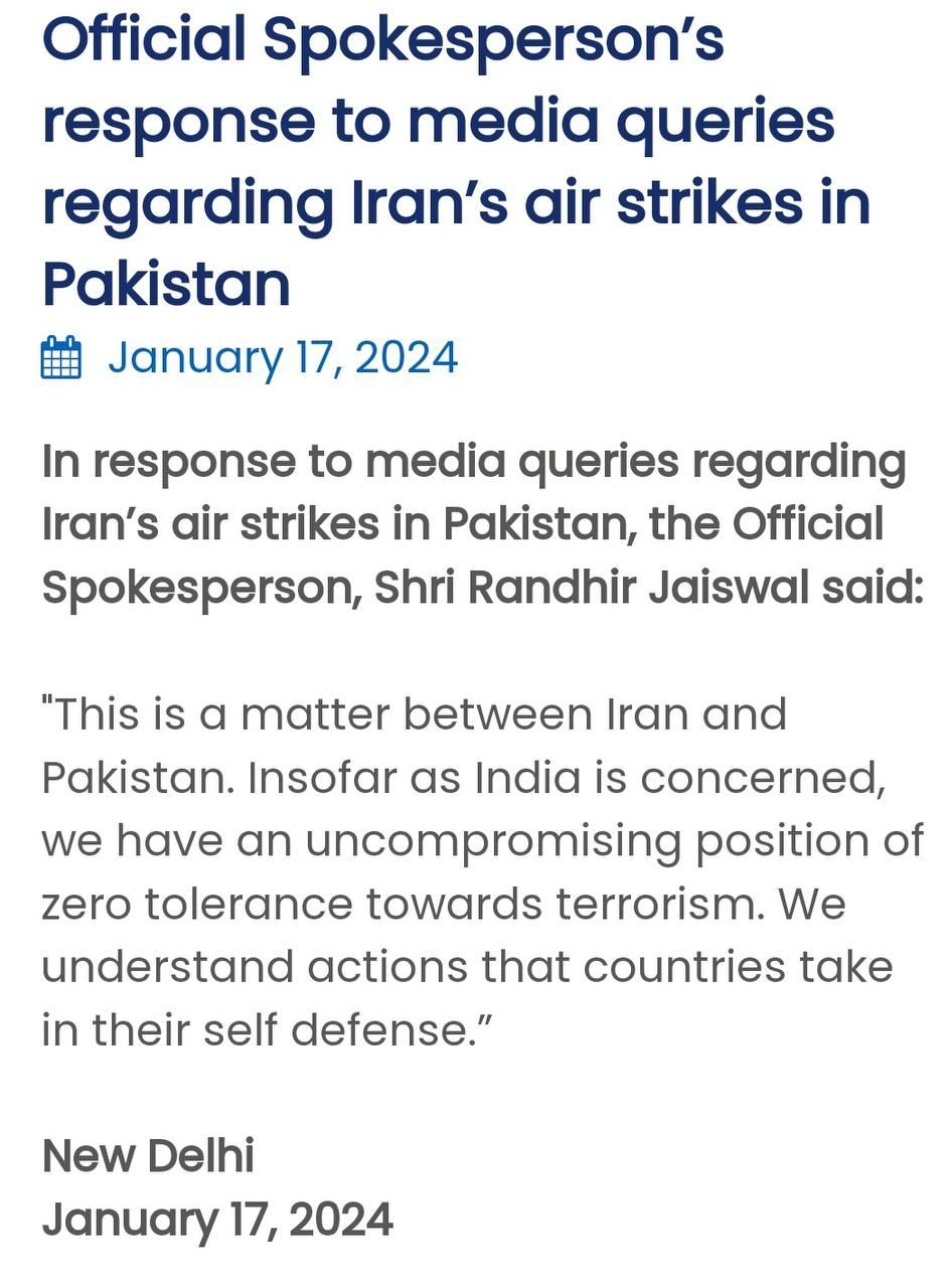 🇮🇳🤝🇮🇷«Мы понимаем действия, которые страны предпринимают в целях самообороны» – Индия оправдывает удары Ирана по территории Пакистана