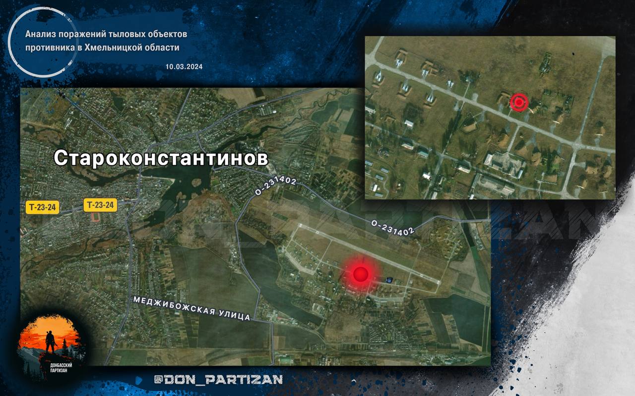Группа из трех ударных дронов атаковала военный аэродром «Староконстантинов», два ударных дрона были повреждены противником на подлете к цели, изменив траекторию следования упали на территорию аэродрома, повредив при этом взлетно-посадочную полосу. Только одной из «Гераней» удалось достичь цели — поврежден пункт контроля метеорологической обстановки, а так же находящаяся в окрестностях техника.