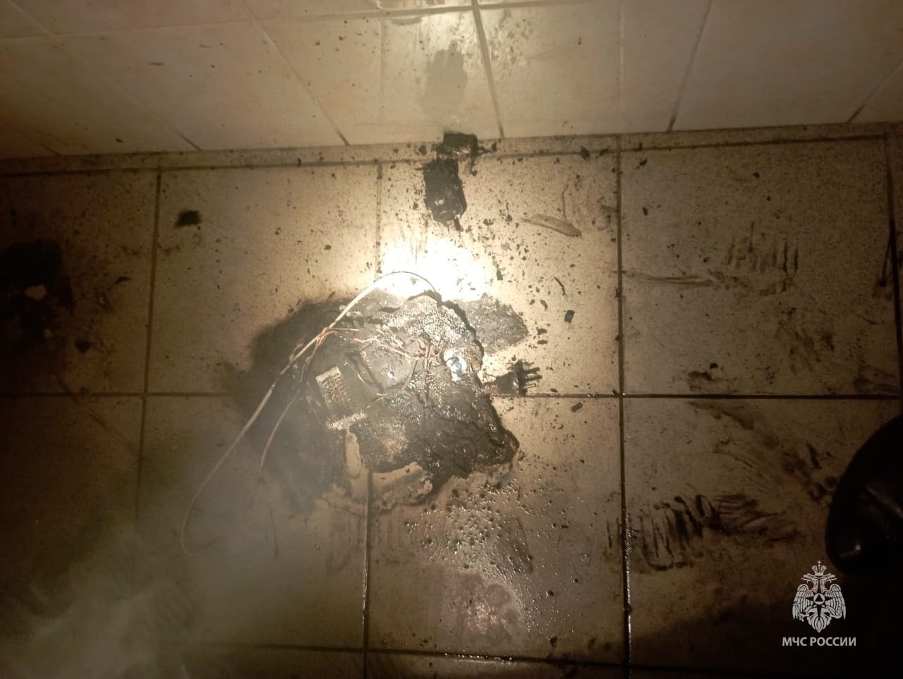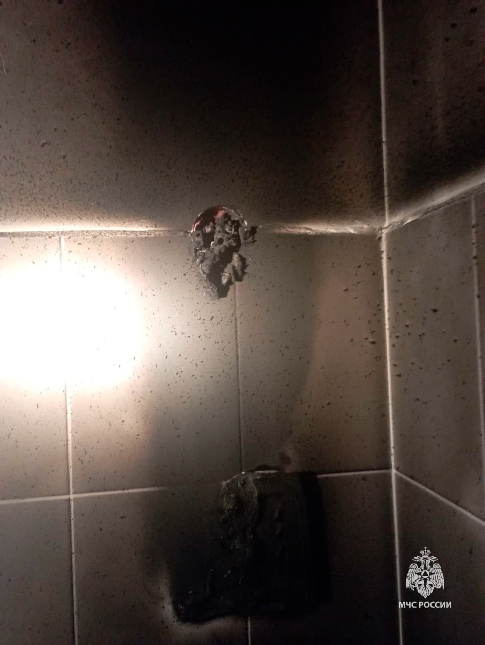 На втором этаже в туалете произошло оплавление прибора для сушки рук на 0,1 кв.м. Потушено до прибытия.