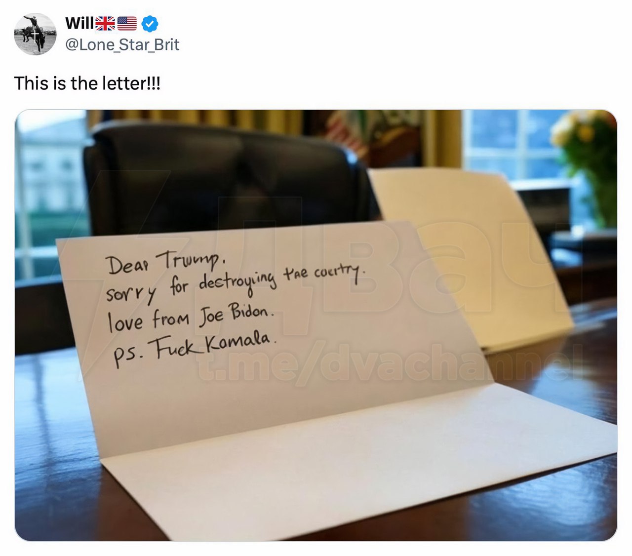 Дональд Трамп, снова оказавшись в Овальном кабинете, обнаружил письмо от Джо Байдена. Это часть традиции, по которой уходящий президент оставляет записку своему преемнику, оставляя её в столе.