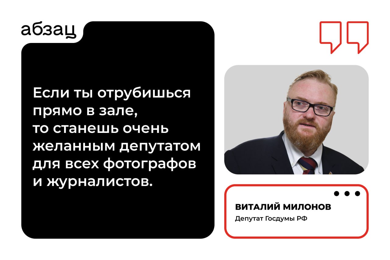 «Чем выше ты сидишь, тем меньше там кислорода, иногда очень клонит в сон. Просто надо это понимать и, если уж ты совсем никак не можешь, всегда можно отпроситься у соседей, отойти, 15 минут вздремнуть у себя в кабинете. Такое действительно происходит, просто надо быть внимательным, понимая, что если ты отрубишься прямо в зале, то станешь очень желанным депутатом для всех фотографов и журналистов», – подчеркнул Милонов.