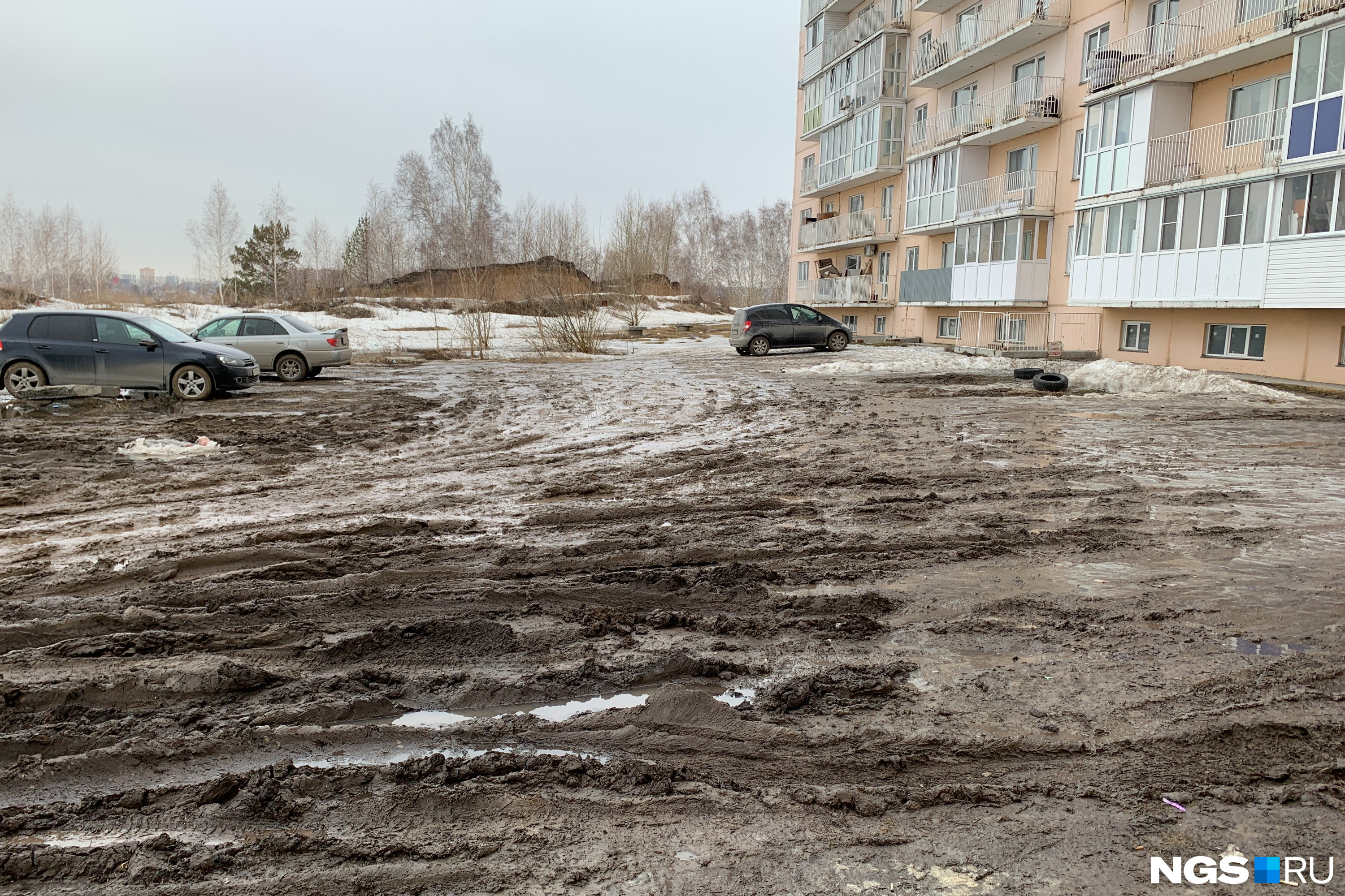 — Это не газон и не парковка, — говорит читатель НГС Андрей (имя изменено по его просьбе), указывая на странное грязевое поле возле дома №7 по улице Виталия Потылицына. — Что-то среднее. Моя машина стоит на парковке, и просто так подойти к ней я не могу, приходится идти в обход. А потом всю эту грязь я на своих колесах везу к вам центр.