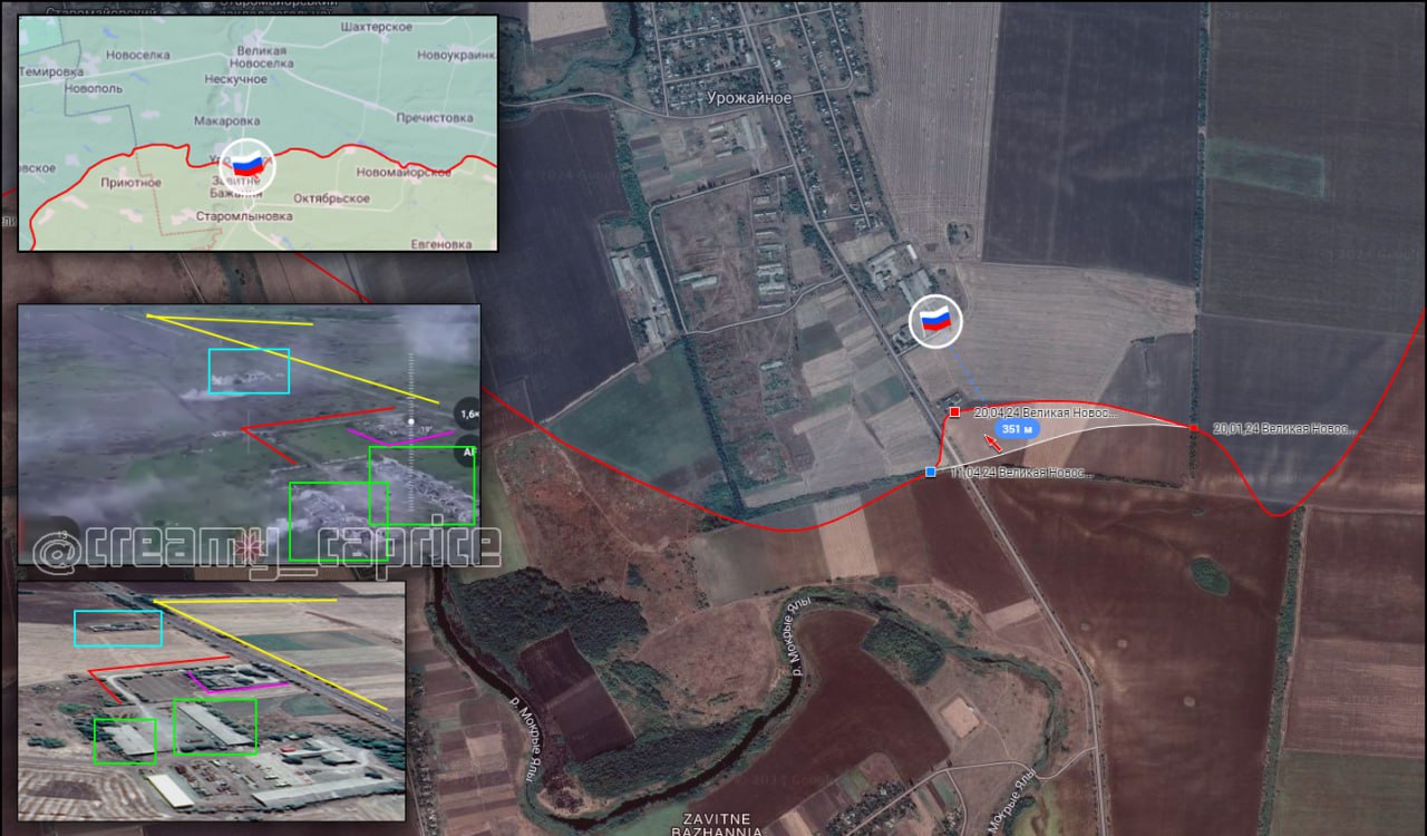 25,04,24 Великая Новосёлка - Урожайное Активные боевые действия в районе Великой Новосёлки. ВС РФ атакует позиции ВСУ на южной окраине Урожайного силами бронетехники и мотострелкового подразделения под огнём со стороны ВСУ. Продвижение ВС РФ в северном направлении более 300 метров. 47.73945, 36.82681 Источник 21+ Геопривязка