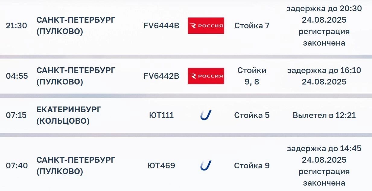 Вылеты рейсов в Санкт-Петербург из Сургута задержаны. Так, самолет авиакомпании «Россия», который должен был вылететь в субботу, 23 августа, в 21:30 теперь стоит в расписании на воскресенье, 24 августа на 20:30 (местное время).