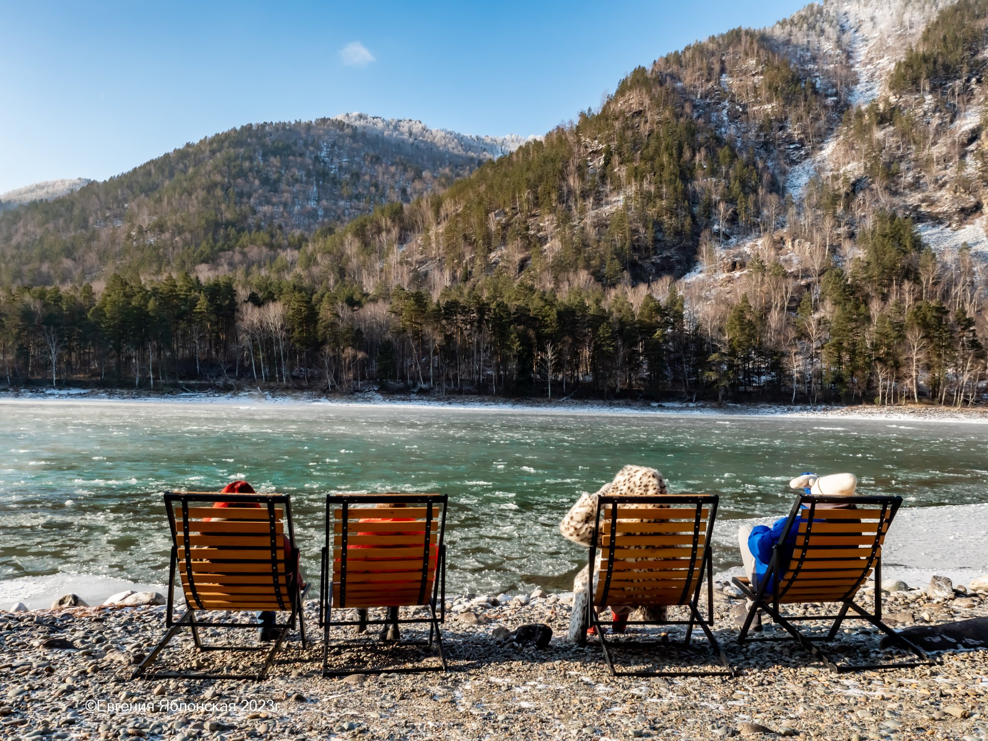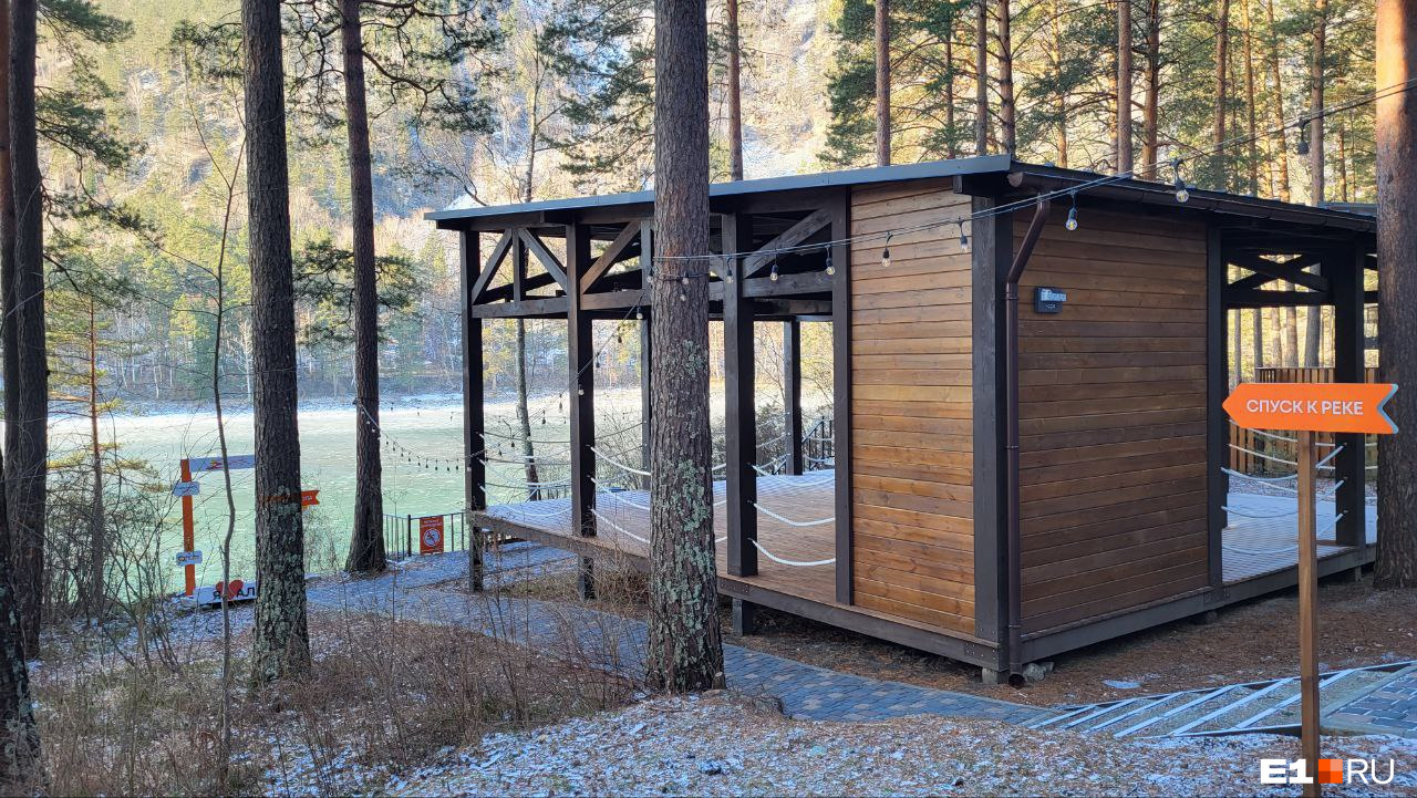 В сотне метров от домиков — спуск к реке Катунь, у берега которой стоят лежаки — так что можно подумать о вечном под шум воды. Зимой — главное потеплее одеться.