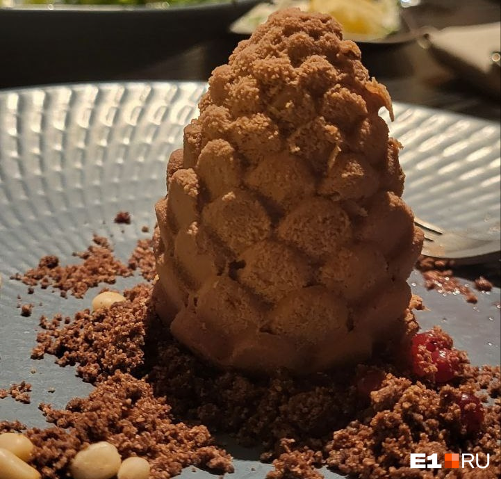 Помимо европейской и русской кухни есть и сибирские акценты — вроде пельменей из марала, чизкейка из белых грибов или пирожного «Шишка» в виде плода ели.