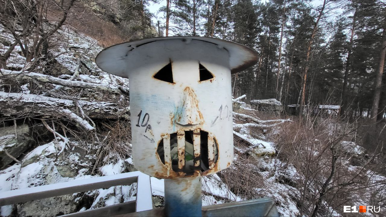 По лестнице можно подняться к самой вершине водопада. За проход просят 10 рублей, но вместо билетера тут голова железного дровосека. На табличке ниже написано, что обслуживание локации требует денег, поэтому те, кто за этим следит, рассчитывают на сознательность туристов, которые сами будут оставлять деньги за проход.