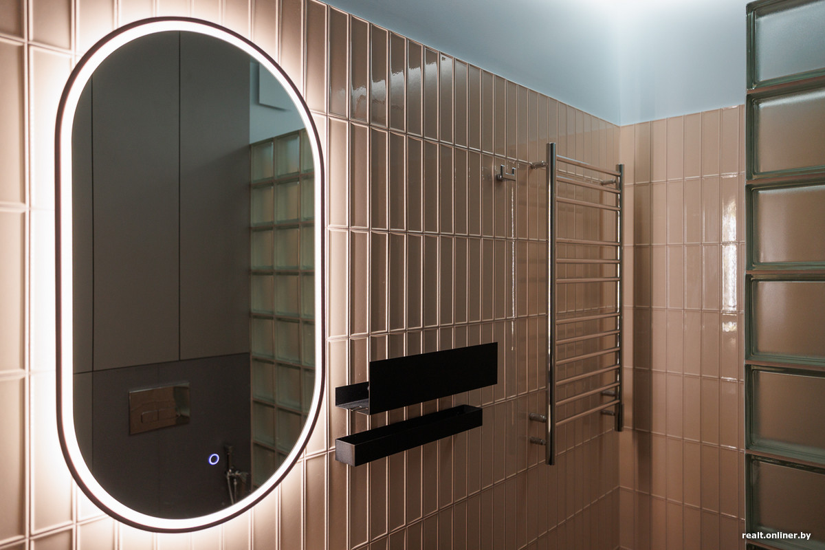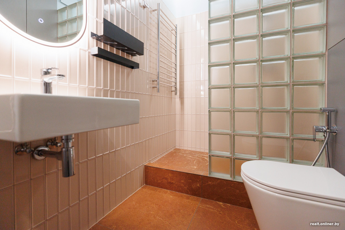 Перегородка из стеклянных блоков будто телепортировалась из интерьера в стиле советский брутализм и смотрится в космической ванной весьма органично.