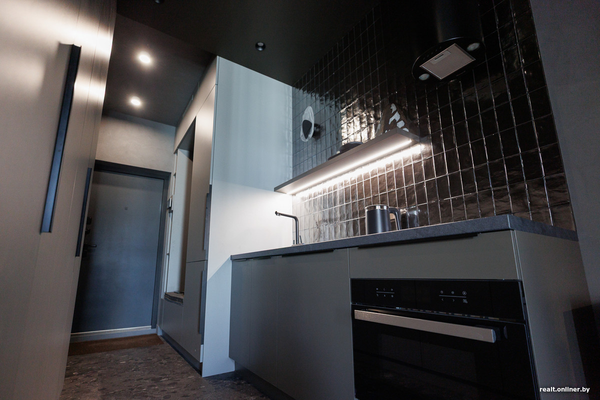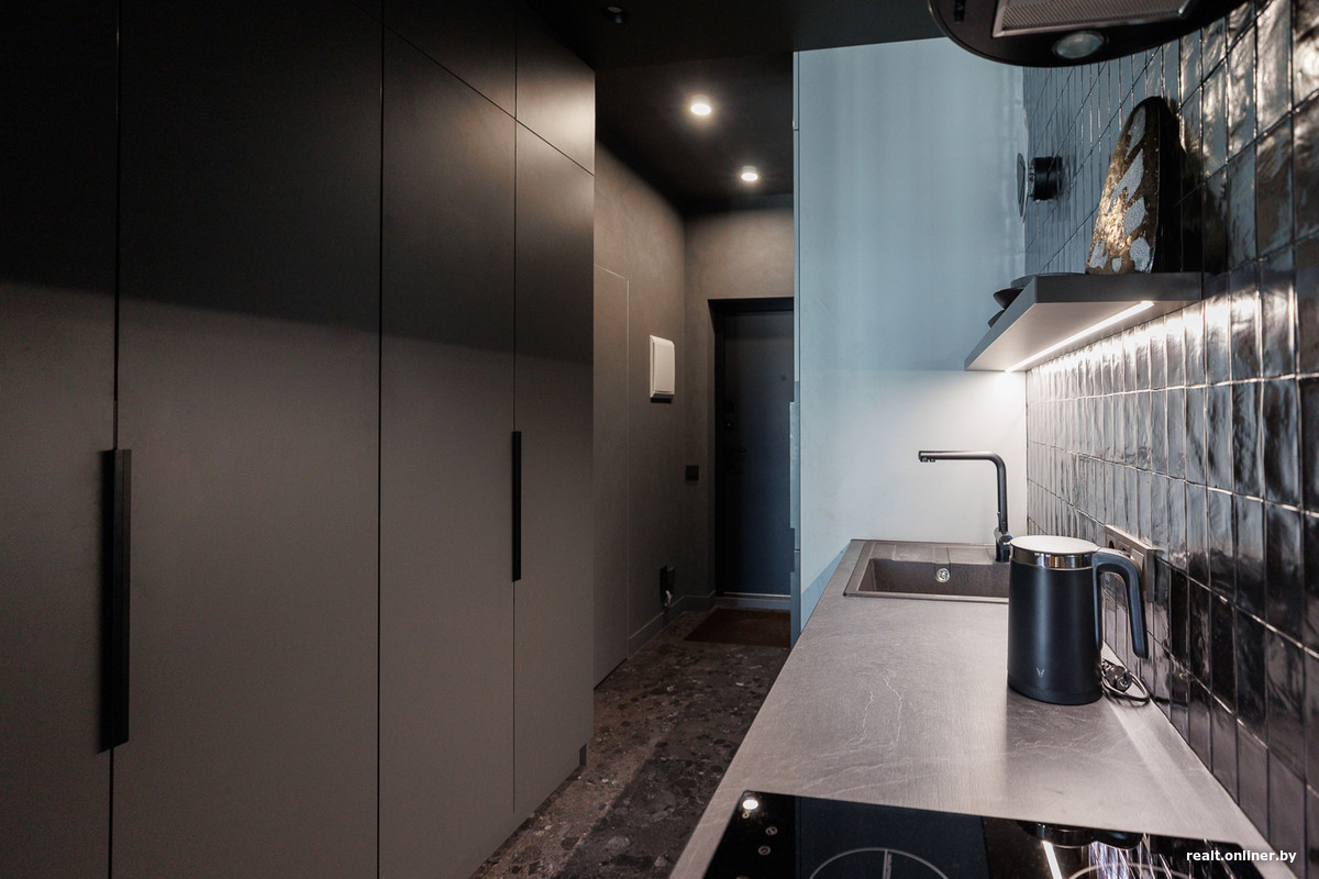 Как часто бывает в квартирах площадью около 30 квадратных метров, кухня здесь воплощена в урезанной версии. Ее разместили в коридоре, который ведет из прихожей в основную зону. Но Юлия подчеркивает, что кухню удалось оснастить всем необходимым: