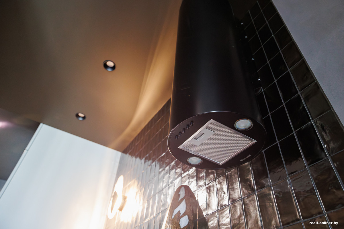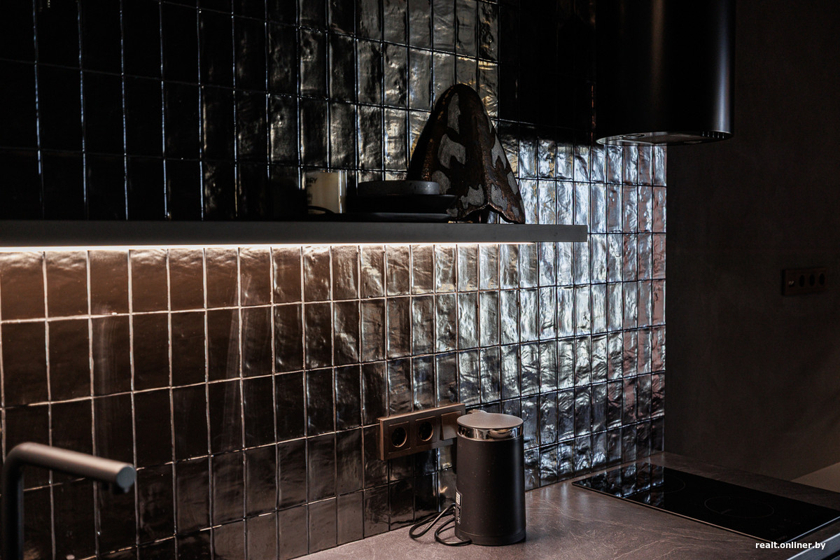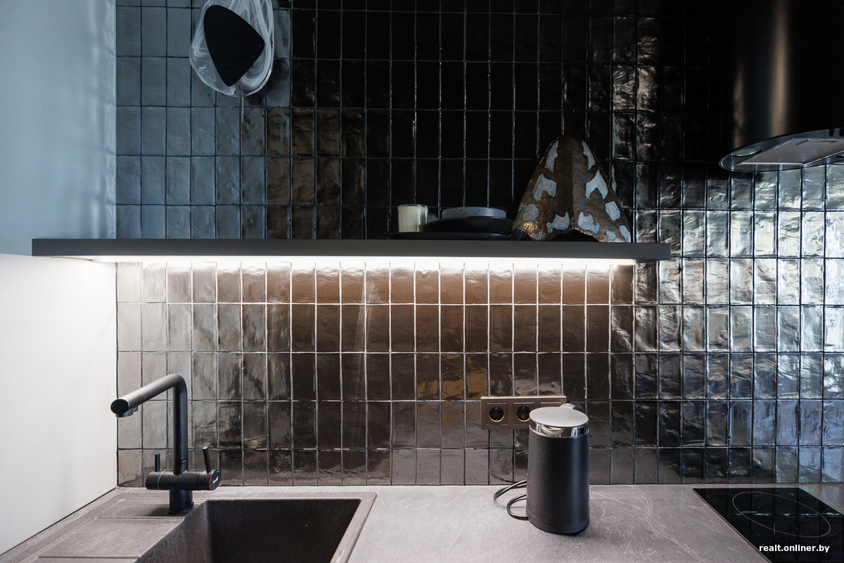 Привлекает внимание светильник фирмы Maytoni, который напоминает какую-нибудь деталь космического корабля. Фартук кухни выполнен из черной керамической плитки с металлизированным эффектом итальянского производства. Фасады и столешница тоже темные. Есть мнение, что черные кухни сложны в уходе и уборке. Юлия отвечает: