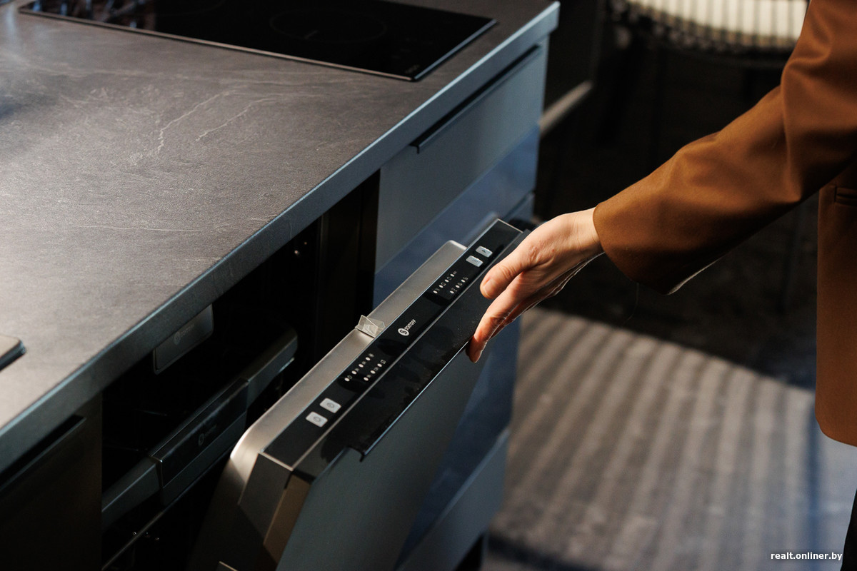 — Встроенный холодильник, метр рабочей поверхности, большая мойка, смеситель для фильтра, широкая посудомойка, духовой шкаф, 2-конфорочная индукционная плита, электрочайник…