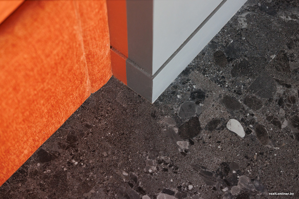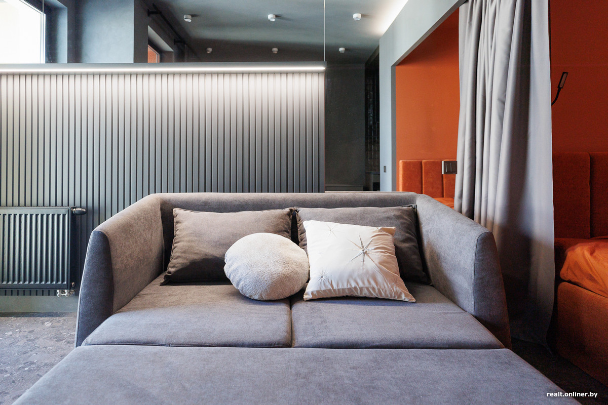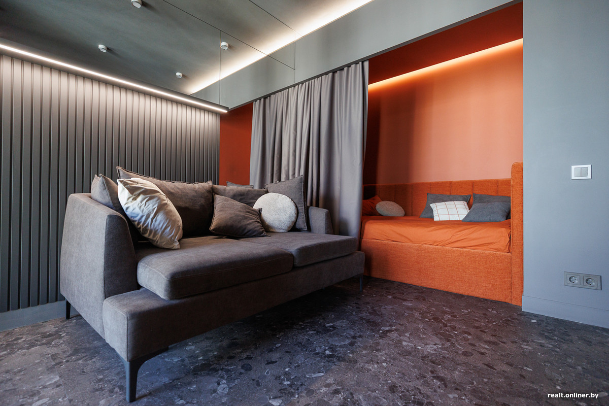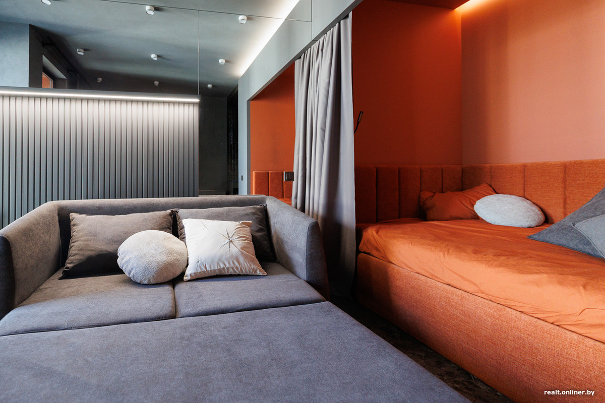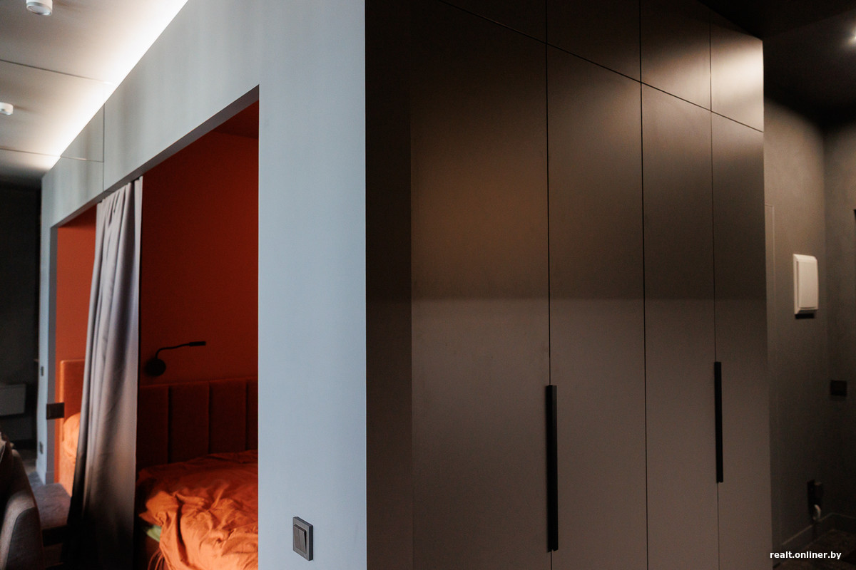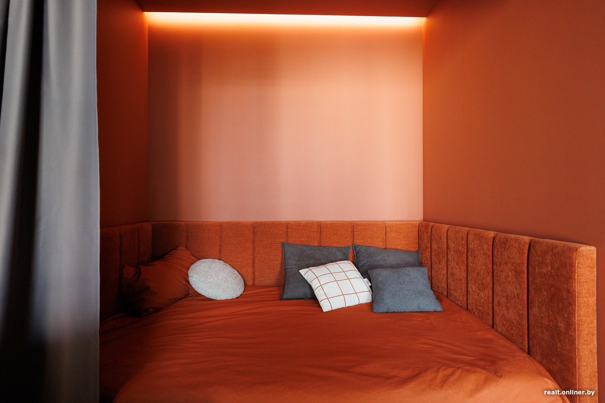 — Это дизайнерское решение, создающее уют. Я хотела, чтобы была возможность закрыть цвет шторами, оставив пространство вокруг серым. Оранжевый цвет Марса продолжается на балконе и в ванной.