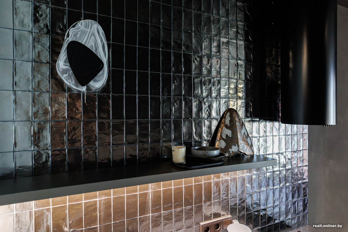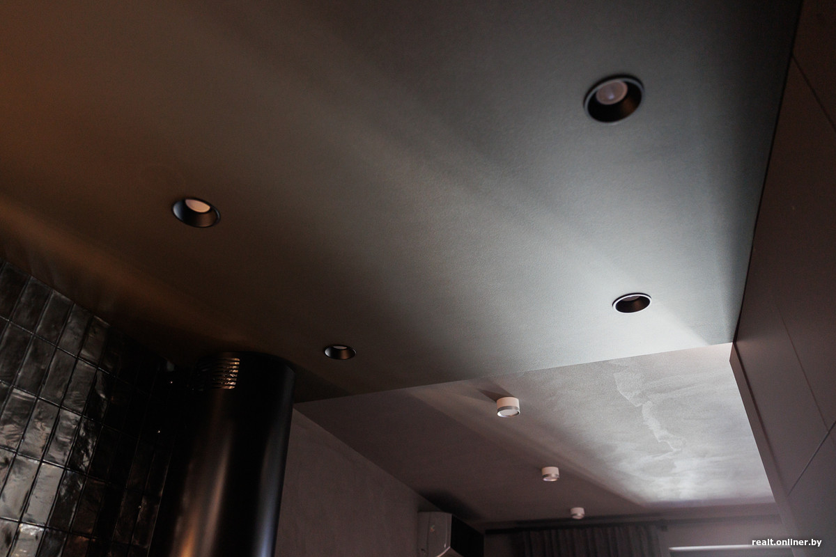 Первое впечатление, возникающее при входе в квартиру, — темно, интимно, загадочно. При желании можно полностью включить освещение, но именно точечно горящие светильники позволяют полностью погрузиться в космическую одиссею.