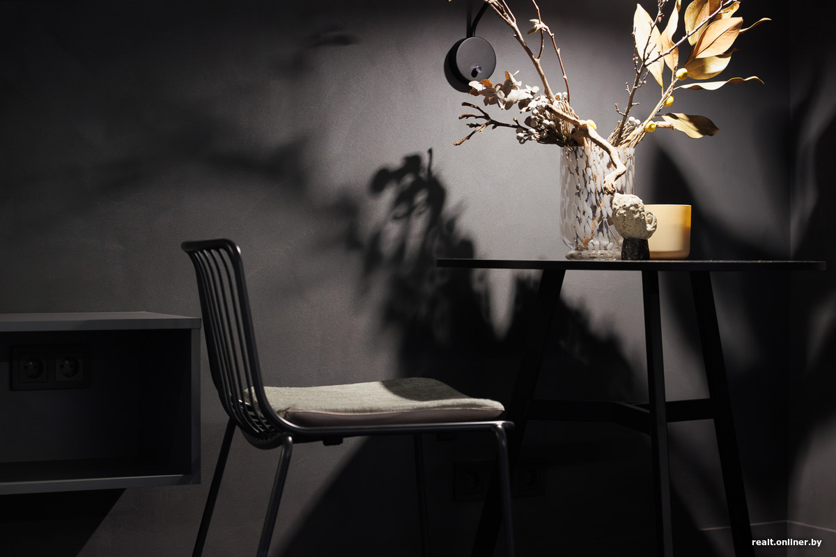 Возле кухни разместилась обеденная зона — такой темный укромный уголок, освещаемый теплым лучом нависающего светильника.