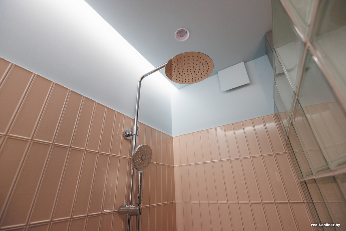 Самым светлым в квартире оказался санузел. Он отличается по дизайну от остального пространства. Такова задумка: жильцы, заходя в ванную, должны расслабляться, менять обстановку. Это помещение олицетворяет рассвет на Марсе: терракотовая земля через розовое зарево переходит в голубое небо.