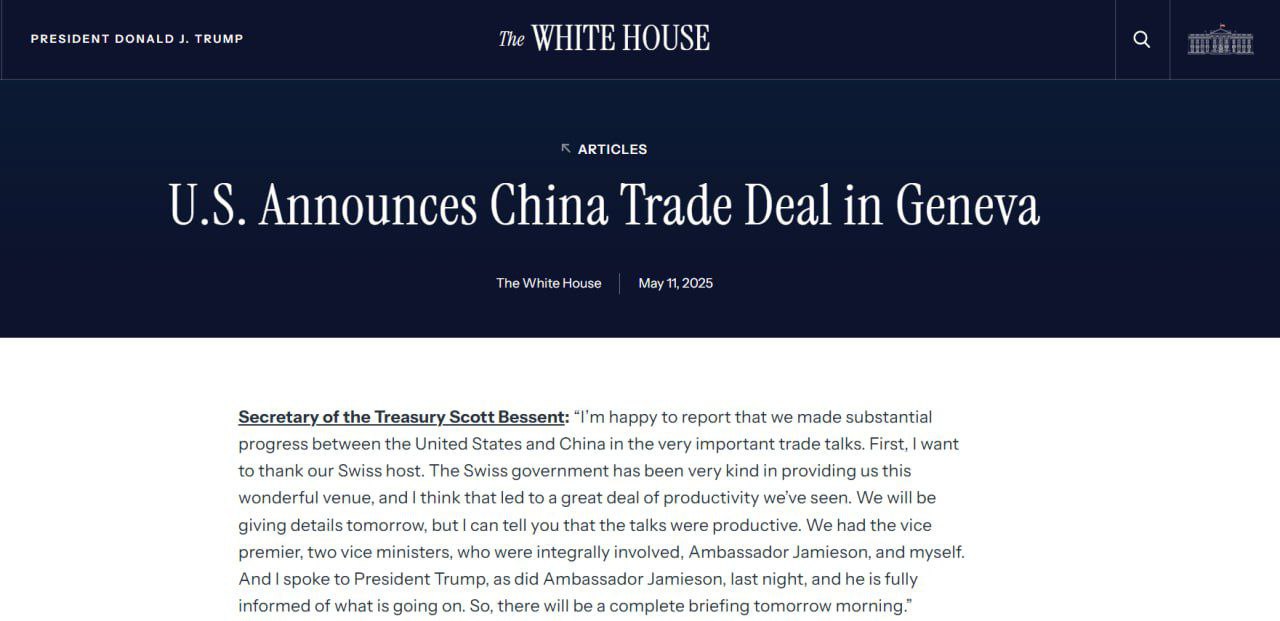 После двух дней переговоров в Женеве, Швейцария, США объявили о торговой сделке с Китаем.