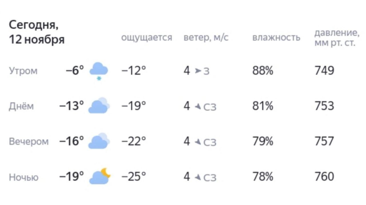 В среду, 12 ноября, средняя температура в Югре составит от -11 до -6 градусов днем, и от -13 до -8 градусов ночью. При этом в северной части при прояснениях днем похолодает до -21 градуса, ночью до -23…-18 градусов, в южной — возможно дневное потепление до -1 градуса. Также обещают небольшой снег. Ветер — юго-западный с переходом в северо-западный, 2-7 м/с.