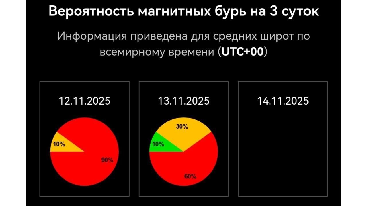 Вероятность магнитной бури 12 ноября — 90%, перехода магнитосферы в возбужденное состояние — 10%. Запаса на сохранение спокойного состояния ученые не оставили.