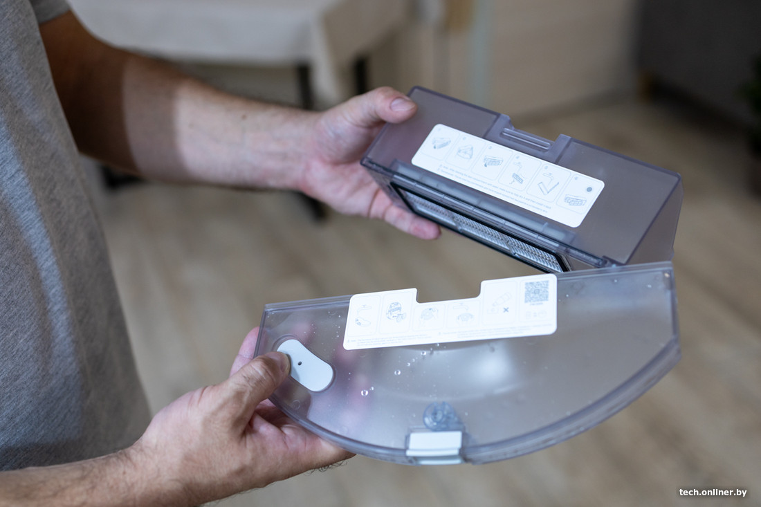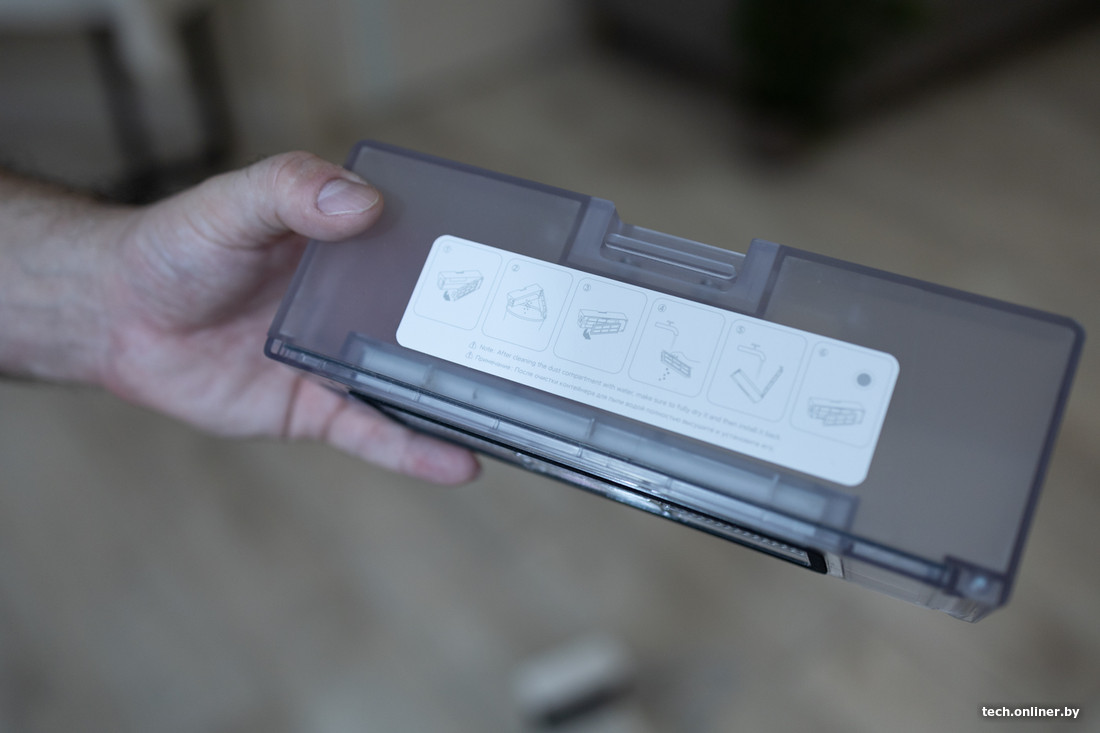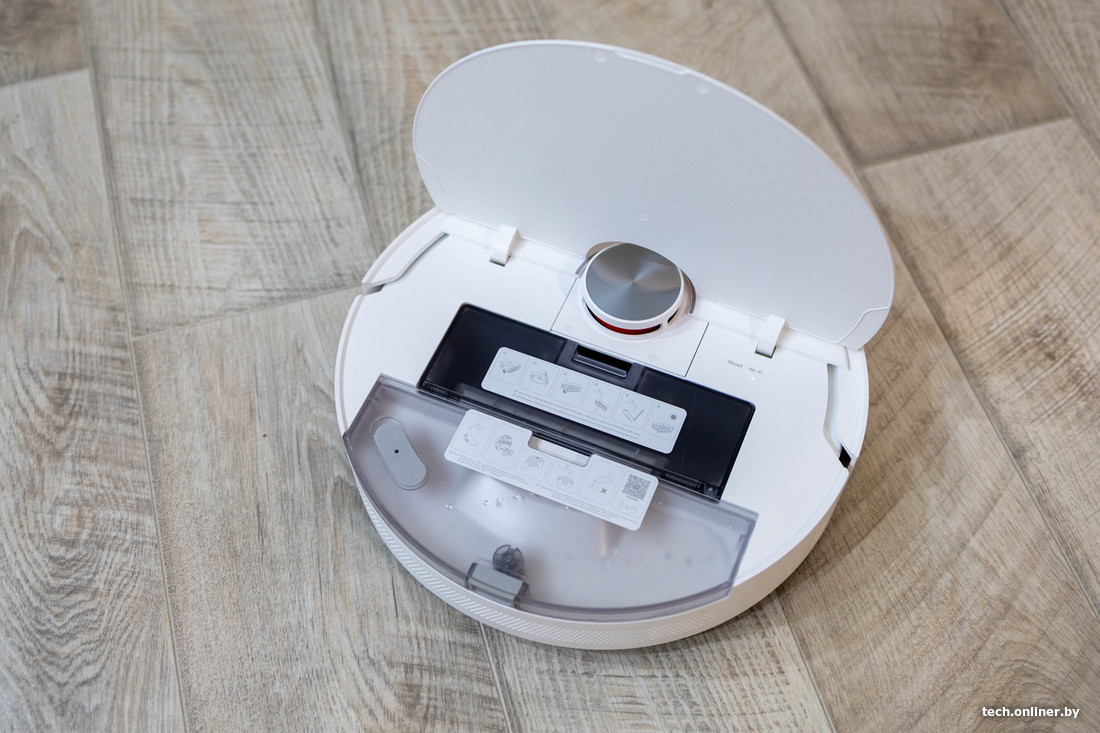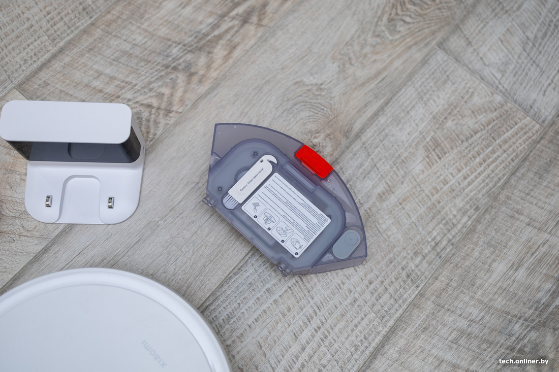 Инструмента для чистки в комплекте нет. Важно отметить, что по инструкции производитель предполагает промывку контейнера для пыли водой, в то время как в инструкции S20 запрещается промывать контейнер под водой. Пылесборник и емкость для воды раздельные и находятся на привычном месте под крышкой, провод зарядной базы заметно толще, чем у S20.