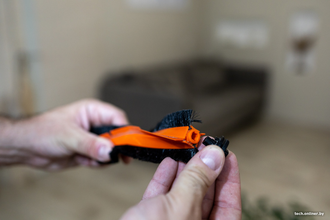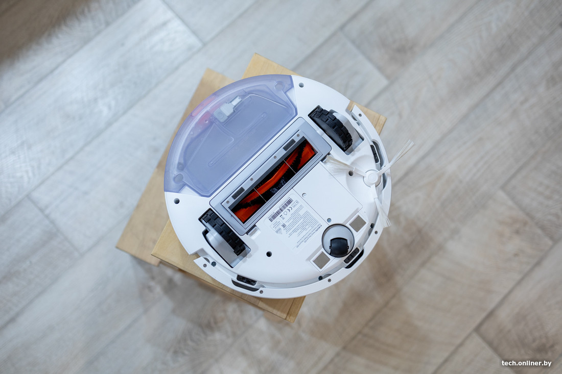Отметим, что пылесборник расположен не под верхней крышкой, а снизу задней части робота-пылесоса. Насадка для влажной уборки обзавелась колесиком, но турбощетка разборной так и не стала, увы.