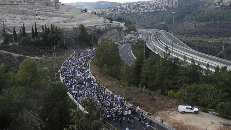 18 ноября 2023 года, Иерусалим, Израиль. Десятки тысяч израильтян во главе с семьями заложников идут по последнему участку шоссе №1, ведущему в Иерусалим. Семьи заложников, захваченных ХАМАСом во время нападения 7 октября, и желающие их поддержать начали пятидневное шествие из Тель-Авива в Иерусалим, где намерены провести демонстрацию перед офисом премьер-министра. По данным организаторов мероприятия, в марше принимают участие более 25 000 человек. Более 240 захваченных в Израиле заложников удерживаются ХАМАСом в секторе Газа. При этом израильские власти отвергли предложение радикальной группировки о выдаче 50 человек в обмен на временное прекращение огня.