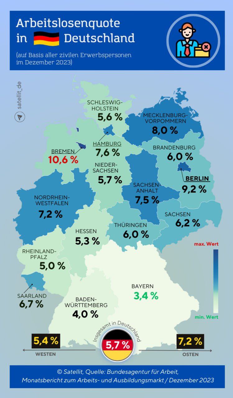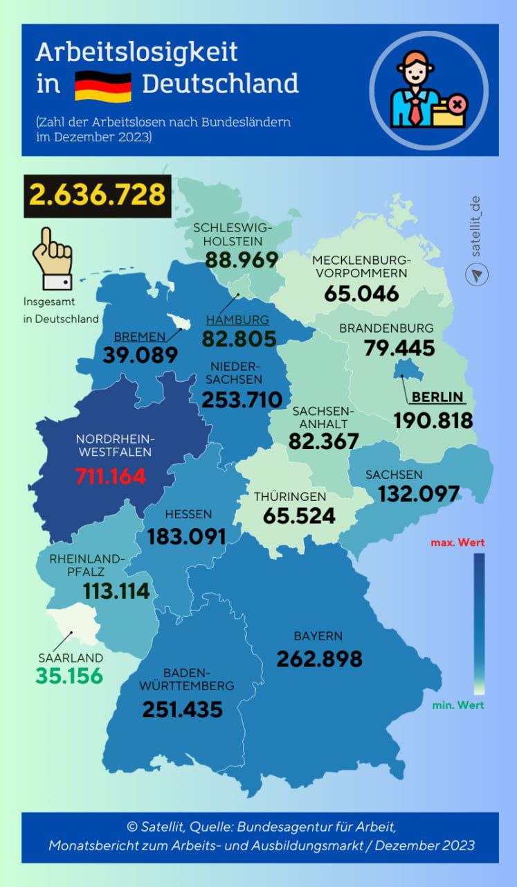 📊Официальное количество безработных граждан в Германии в декабре 2023 года достигло 2 млн 636 тысяч человек