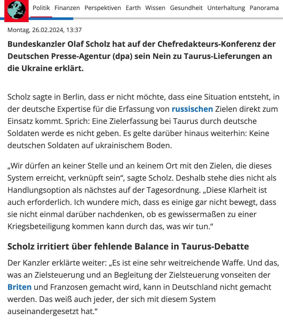 Канцлер Германии Олаф Шольц назвал окончательным решение не передавать Украине дальнобойные ракеты “Taurus”. Он заявил, что не хочет, чтобы возникла ситуация, в которой немецкие знания и опыт будут использоваться непосредственно для обнаружения российских целей. "Скажем так: захвата цели "Taurus" немецкими солдатами не будет. Кроме того, по-прежнему остается фактом то, что на украинской земле нет немецких солдат." - сказал канцлер. "Мы не должны быть связаны с целями, которых достигает эта система в любой точке и в любом месте. Эта ясность также необходима. Меня удивляет, что некоторые люди даже не задумываются о том, что то, что мы делаем, может привести к участию в войне", - сказал Шольц. "Это очень дальнобойное оружие. И то, что делают британцы и французы в плане контроля целей и их сопровождения, не может быть сделано Германией. Любой, кто имел дело с этой системой, знает это", - заявил он, тем самым подтвердив участие британский и французский военных в операциях против России на территории Украины. Крылатая ракета класса "воздух-земля" “Taurus” - это аналог французской "Skalp-EG" и британской "Storm Shadow". Это значит, что французские и британские военные советники вполне могли обеспечивать сопровождение целей для немецких ракет. Заявление Шольца - это проявление принципиальной позиции по Украине. 22 февраля в бундестаге отклонили резолюцию оппозиционного союза ХДС/ХСС с призывом передать Киеву крылатые ракеты, прошла более мягкая резолюция от правящей коалиции с разрешением предоставления дальнобойного вооружения, но без упоминания “Taurus”.