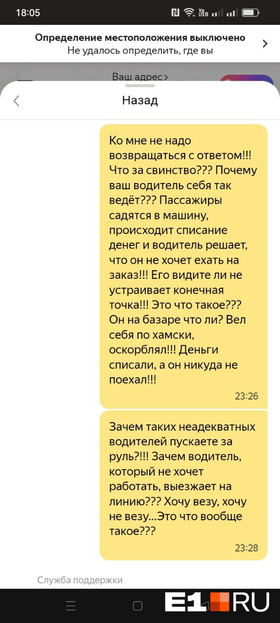— Мы вызвали такси, водитель приехал, сделал отметку, что пассажиры в машине. Сразу автоматически с карточки списалось 470 рублей. Он увидел, что в заявке три адреса, и сказал, что не поедет: «У вас конечная точка — Рощинская, я потом оттуда не уеду, отменяйте заказ», — рассказала наша собеседница.