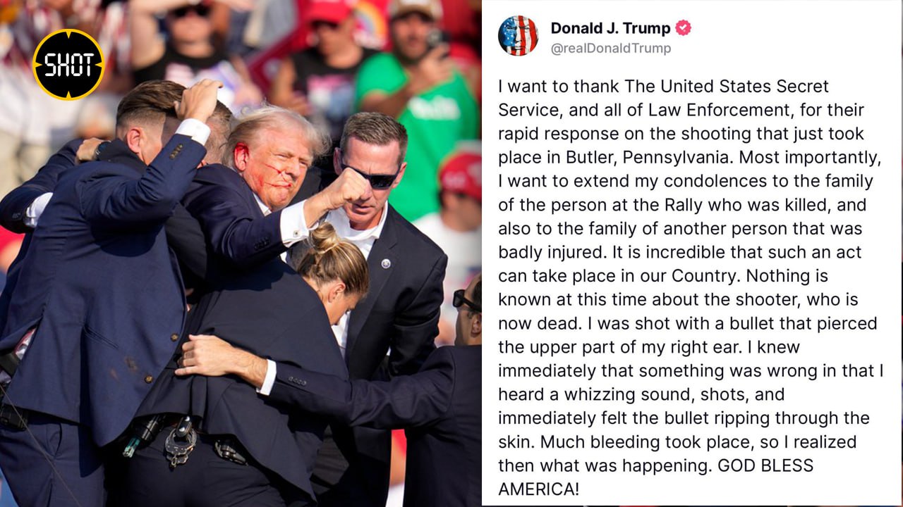 На данный момент о стрелке, который сейчас мёртв, ничего не известно. Пуля, которую в меня выпустили, пробила верхнюю часть правого уха. Я сразу понял, что что-то не так, услышал свист, выстрелы и сразу почувствовал, как пуля разрывает кожу. Началось сильное кровотечение, и тогда я понял, что происходит. БОЖЕ, ХРАНИ АМЕРИКУ!", — написал Трамп.