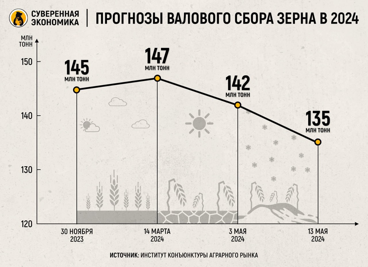Изменение прогнозов по урожаю в худшую сторону уже происходило в начале мая. Тогда из-за засухи на юге России ожидалось значительное снижение сбора пшеницы. Осадков было на 20—40% меньше нормы, при этом температура оказалась на 2—4 градуса выше. Это привело к дефициту влаги и ухудшению севооборота. Тогда прогноз по сбору понизили на 3,4%.