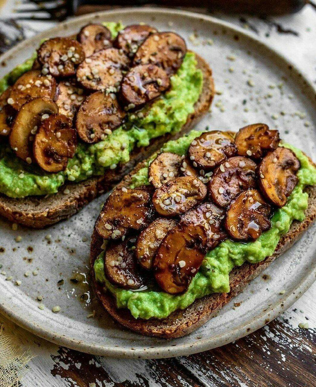 4. Толстым слоем намазать авокадо и выложить грибы.