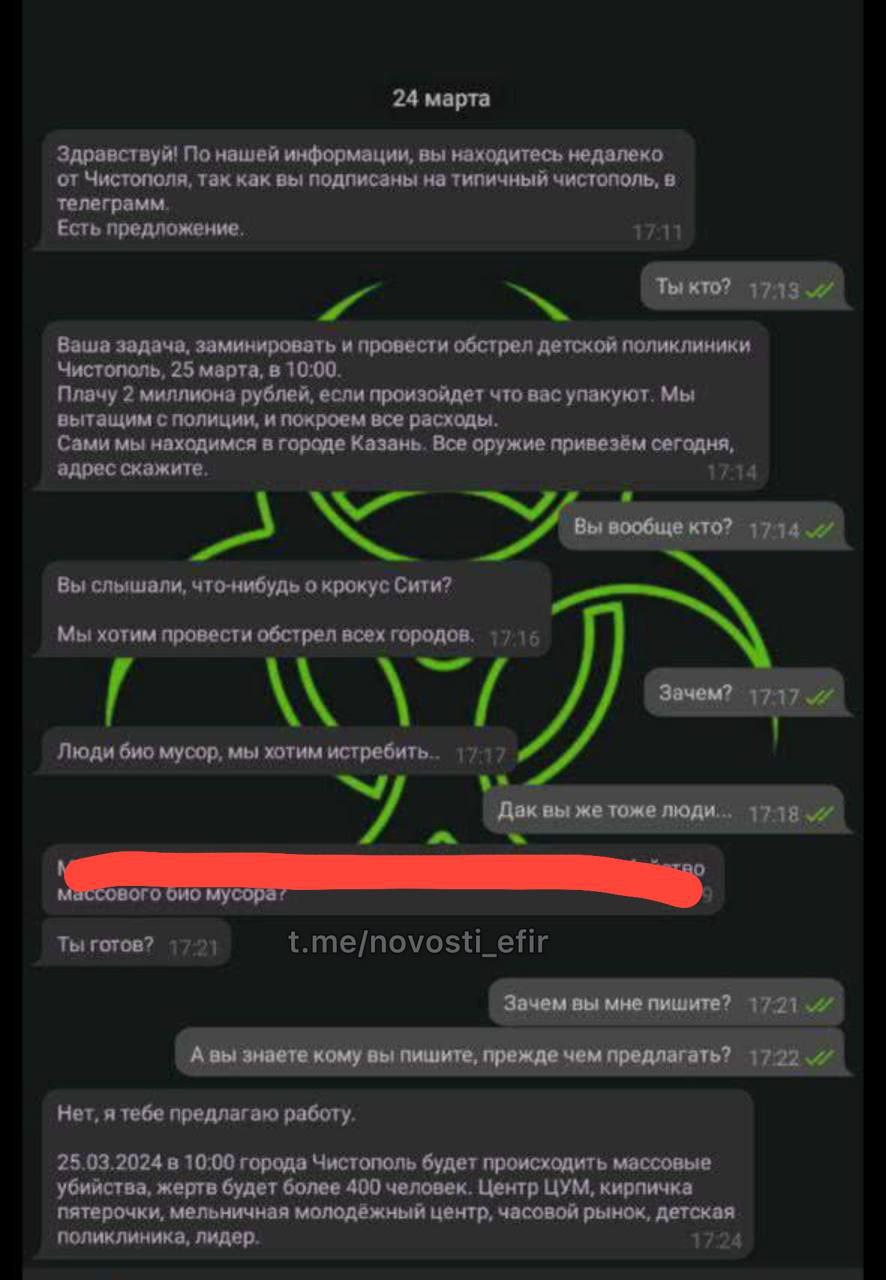 У нас вал сообщений из разных регионов, где боты предлагают совершить теракты за деньги! Телеграм тут лидер, но были сообщения в Ватсап и соцсетях.
